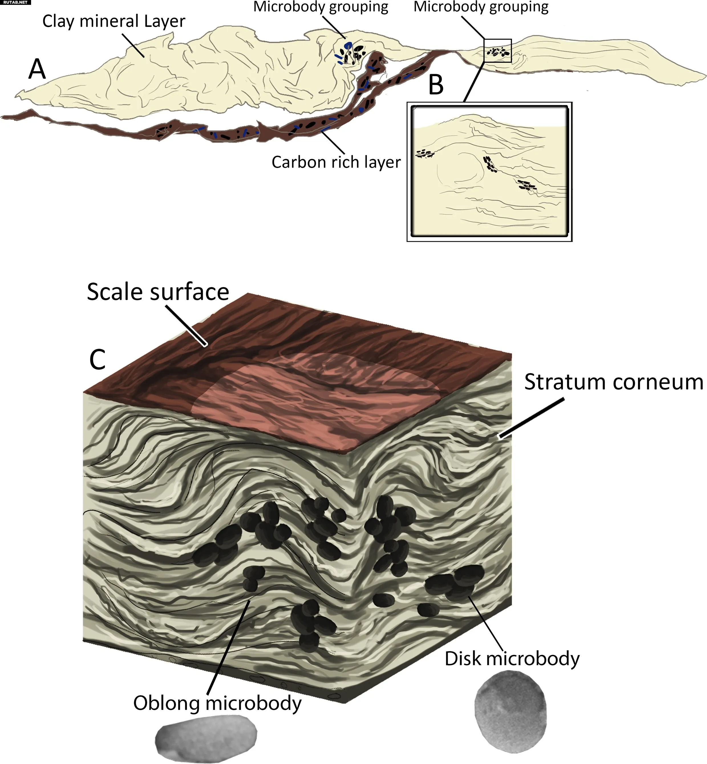 Учёные из Бристольского университета под руководством Тесс Галлахер обнаружили продолговатые и дискообразные микротельца, которые интерпретируют как меланосомы. Ранее разнообразие форм меланосом находили только в окаменелых перьях динозавров, но не в чешуе.