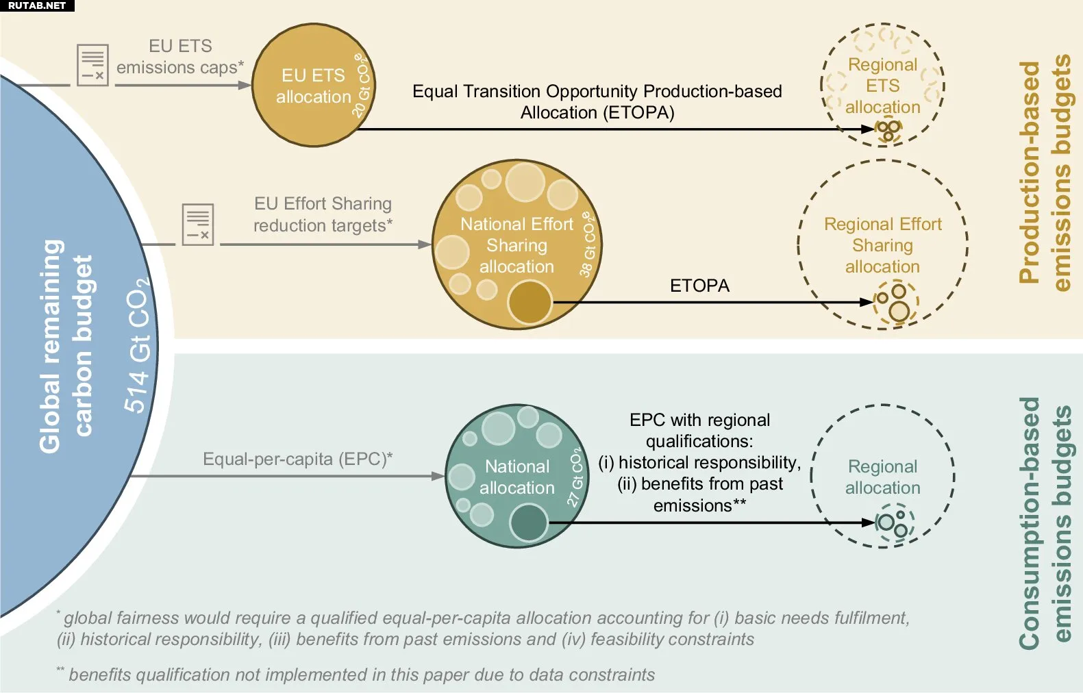 Для CO2, образующегося в результате работы местной экономики и промышленности, ученые вводят механизм ETOPA (Equal Transition Opportunity Production-Based Allocation). Он учитывает разные региональные экономические структуры и риски при переходе к климатической нейтральности.