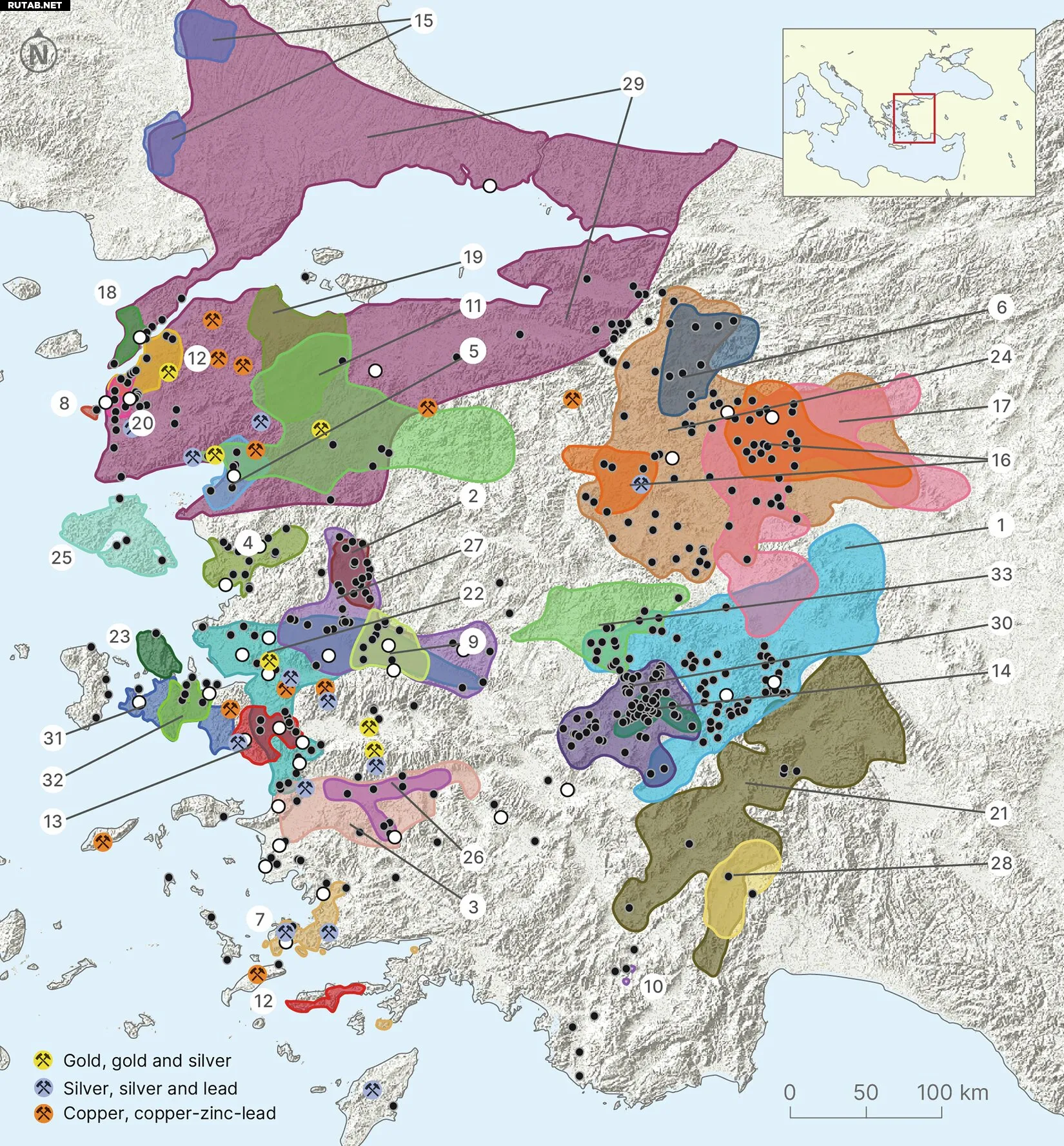 Карта-рельеф Западной Турции с обозначением археологических раскопок (белые точки), поселений (черные точки), зон археологических исследований и месторождений руд. Автор: Scientific Data (2025). DOI: 10.1038/s41597-025-06241-9