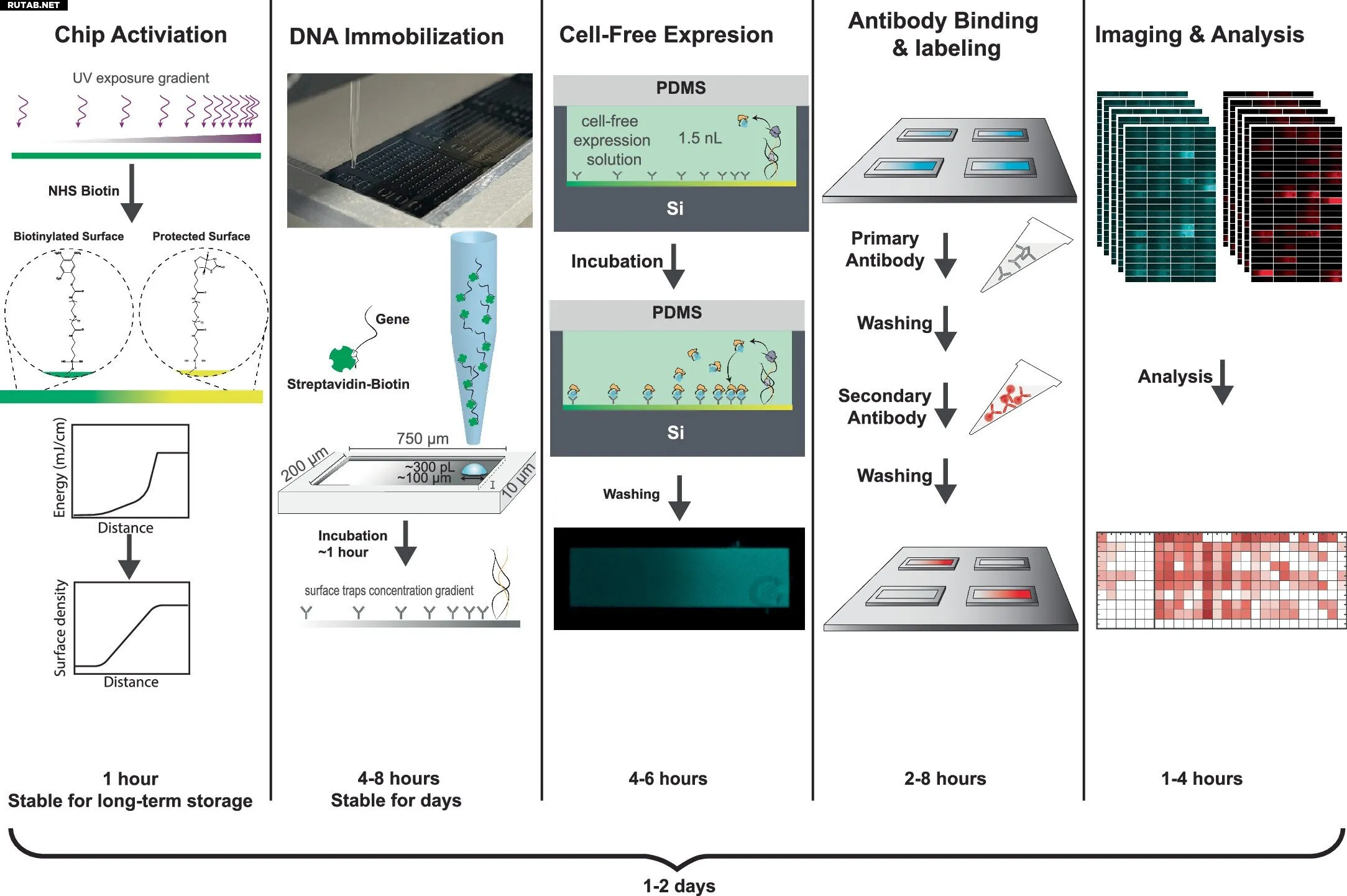 «Нам не нужно ничего выращивать или очищать заранее — каждое пятно на чипе создаёт свой собственный белок», — объясняет один из авторов работы, доктор Орора Дюпен. Это позволяет в одном эксперименте протестировать реакцию антител на 30–40 различных антигенов и измерить силу их связывания.