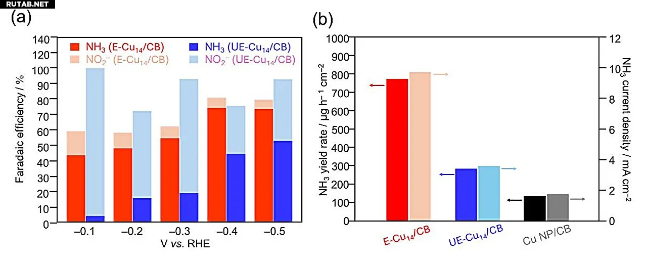 Ключевым достижением стала разработка метода контролируемого синтеза нанокластеров, где путём подбора тиолатных лигандов (SR) удалось либо «открыть», либо «скрыть» активные атомы меди на поверхности. Катализатор с открытым активным центром (E-Cu14/CB) показал фарадеевскую эффективность производства аммиака 78%.