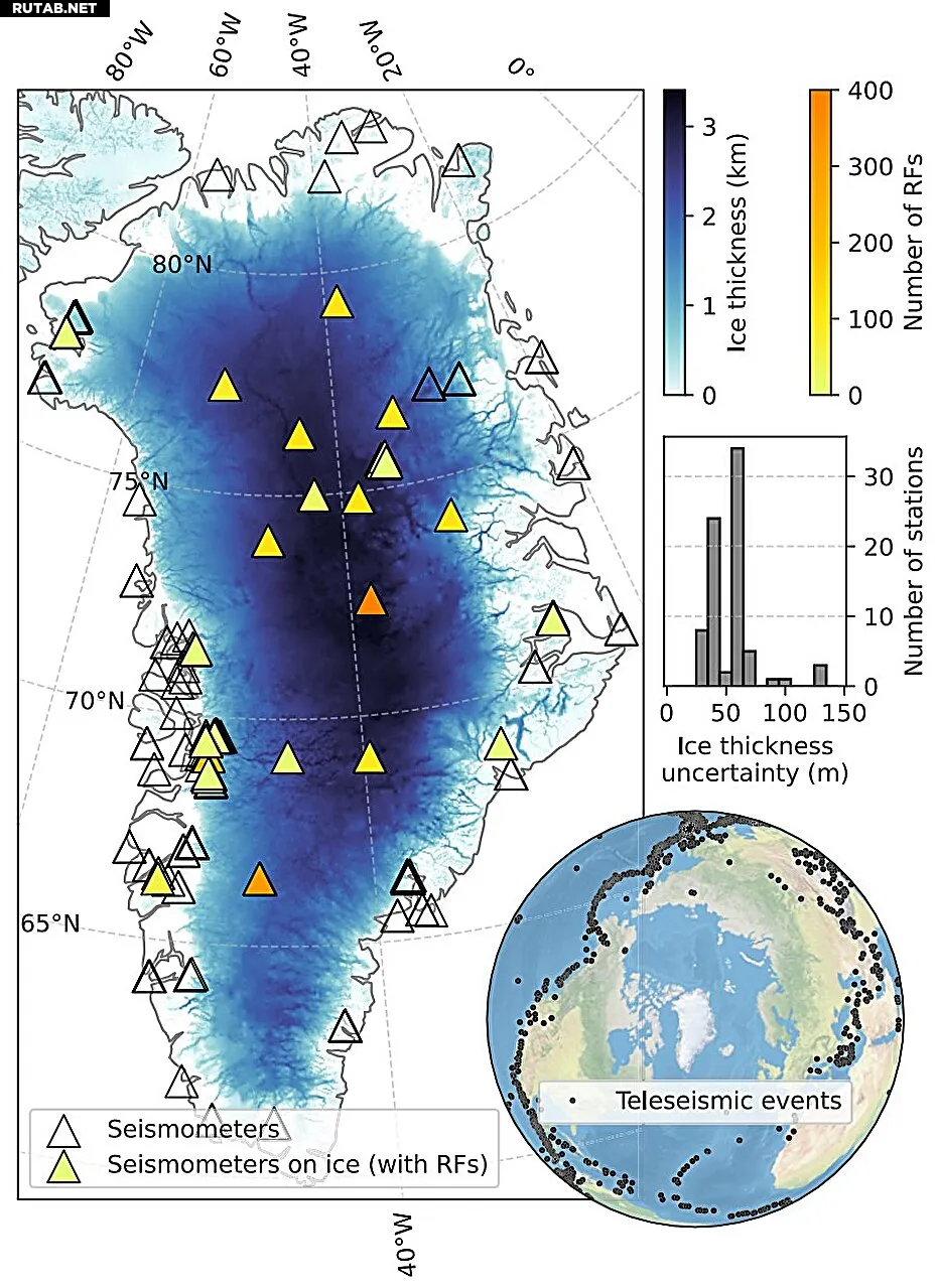 Карта сейсмических данных по Гренландии. Цветные треугольники обозначают станции на льду, где были получены результаты по приёмным функциям. Автор: Geology (2025). DOI: 10.1130/g53653.1