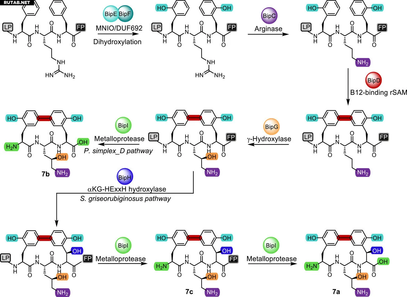 Исследовательская группа под руководством Тобиаса Гульдера впервые описала все ферментативные шаги, превращающие простой пептид в активную молекулу. Особый интерес представляет ферментная пара BipEF, которая одновременно вводит в пептид химические группы и разрезает его — такая двойная функция ранее не наблюдалась в этом семействе ферментов.