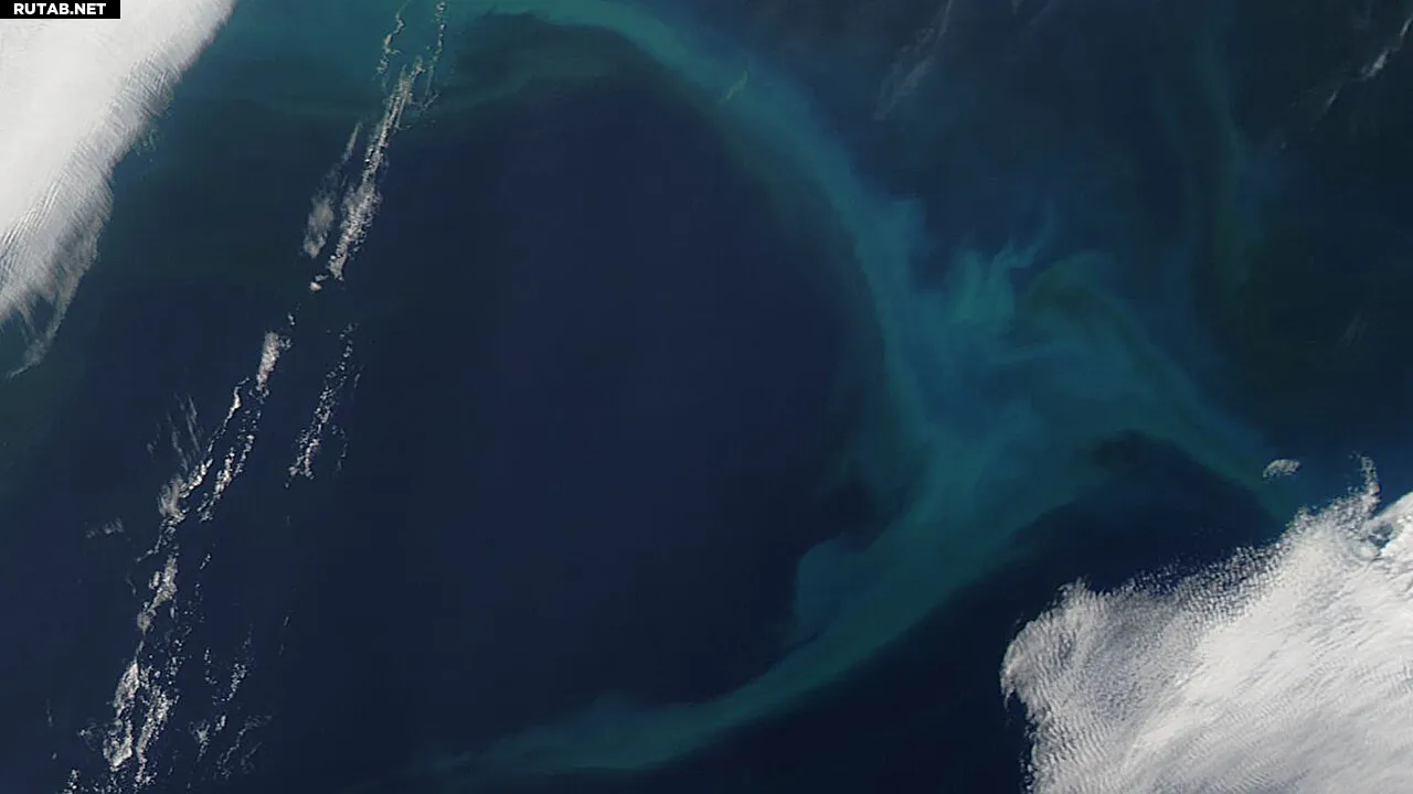 Фитопланктон (светло-голубые и зелёные завитки на спутниковом снимке) зависит от растворённого железа. Новое исследование проясняет его динамику у Гавайев. Автор: Джефф Шмальц, группа MODIS Land Rapid Response Team, NASA GSFC.