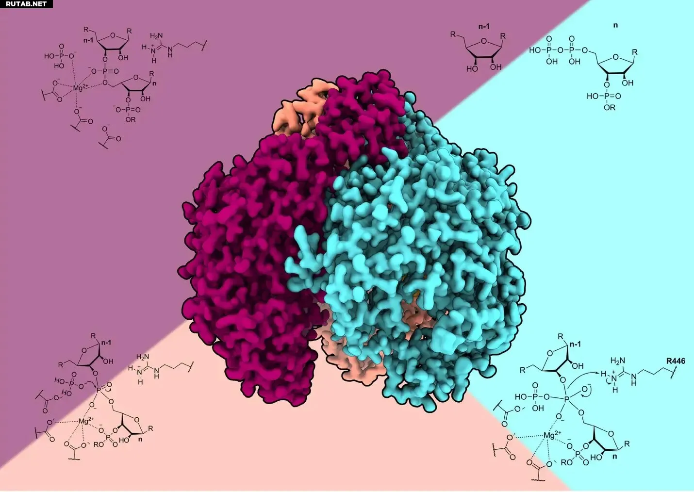Структуры также показали, что ион магния играет двойную каталитическую роль, а одноцепочечная РНК проникает в активный центр фермента не через центральную пору, как у бактериальных аналогов, а снизу. Это стало неожиданным открытием.