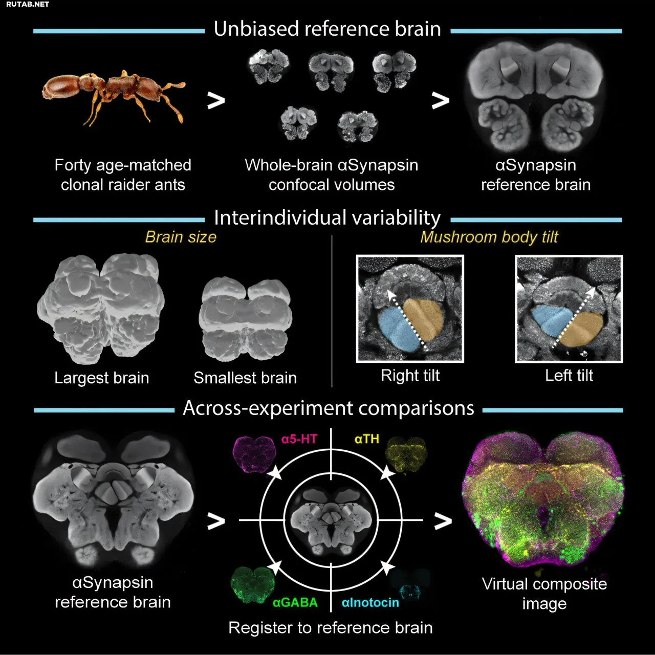 Исследователи из Лаборатории социальной эволюции и поведения Рокфеллеровского университета под руководством Дэниела Кронауэра создали первый эталонный мозг для клонового муравья-рейдера (Ooceraea biroi). Этот вид, размножающийся бесполым путём, представляет собой идеальную модель для нейробиологии, так как все особи генетически идентичны, рождаются одновременно и живут в одинаковых условиях.