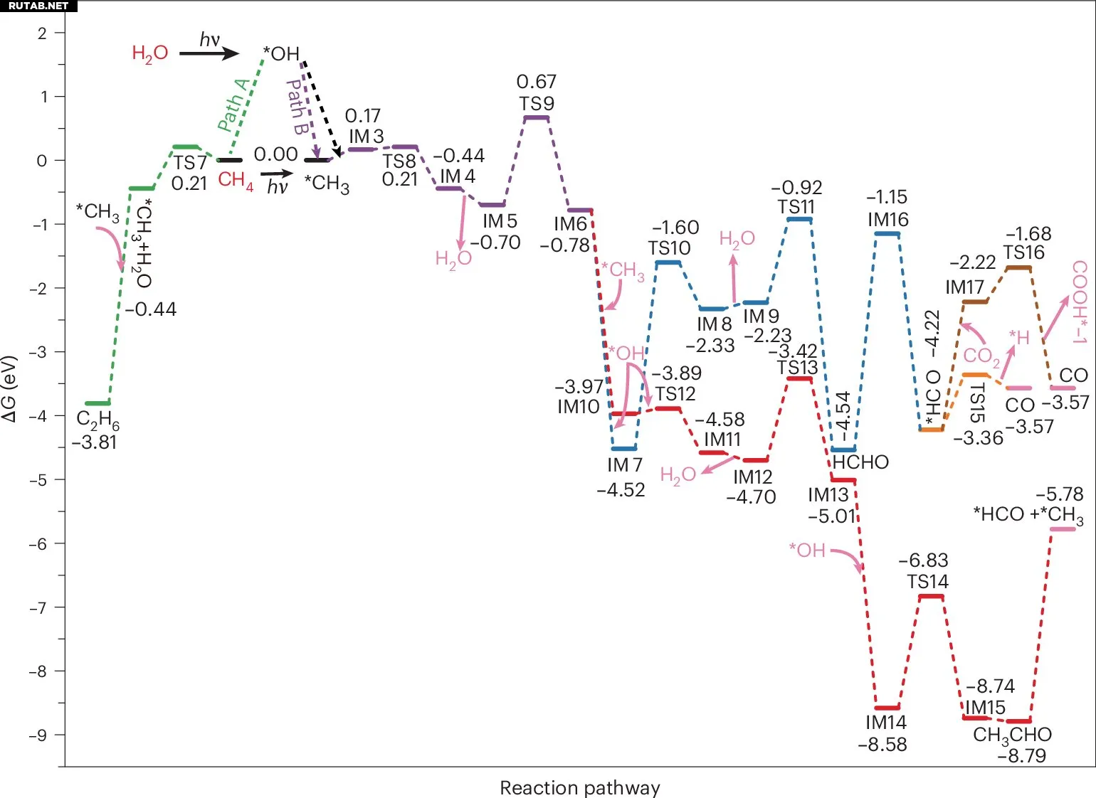 Диаграмма свободной энергии Гиббса для реакции конверсии CH4 и CO2 с H2O. Автор: Nature Photonics (2025). DOI: 10.1038/s41566-025-01800-3