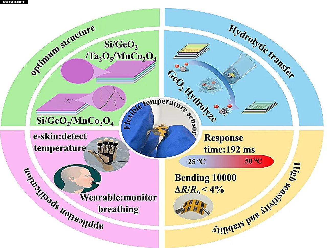 Используя этот метод, команда создала ультратонкий гибкий температурный датчик общей толщиной всего 40 микрометров. Для обеспечения качества интерфейса после переноса исследователи также разработали гетеропереходную структуру GeO2/Ta2O5/MCO, которая подавляет диффузию элементов и тепловое напряжение на границе раздела, повышая надёжность устройства.