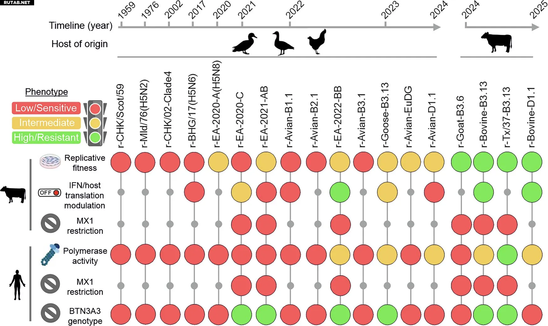 Исследование показало, что способность вирусов H5N1 заражать клетки коров и ткани молочной железы зависит от изменений, которые вирусы приобретали постепенно с течением времени. Учёные также обнаружили, что вирусы птичьего гриппа сильно различаются по своей способности к репликации в клетках коров. Это означает, что некоторые птичьи вирусы уже могут быть ближе других к возможности заражения крупного рогатого скота и, потенциально, других млекопитающих.
