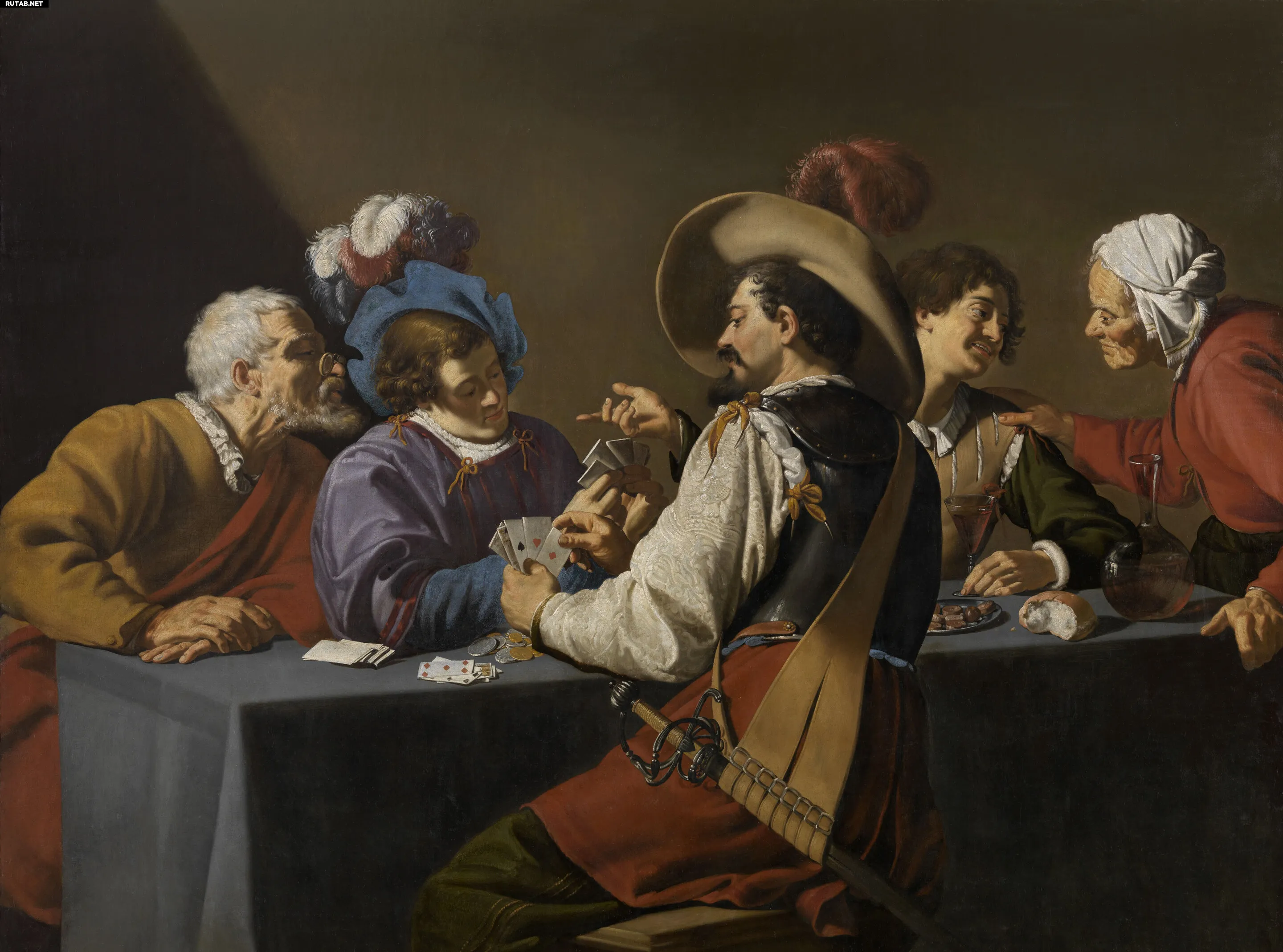 Теодор Ромбоутс, «Игроки в карты», XVII век. Указательный жест фигуры справа подчеркивает насмешку над наивностью молодого игрока.