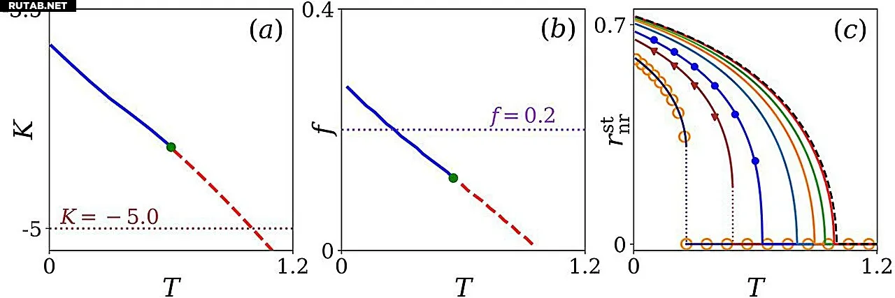 На панелях (a) и (b) сравнивается фазовая граница без сброса (слева) и со сбросом подсистемы (в центре), показывая, что сброс лишь части системы (f) может смещать и изменять кривую фазового перехода в зависимости от температуры (T). Панель (c) показывает, как стационарный параметр порядка не сбрасываемой подсистемы меняется с температурой при разных частотах сброса. Авторы: Аниш Ачарья, Рупак Маджумдер, Шамик Гупта (TIFR, Мумбаи).