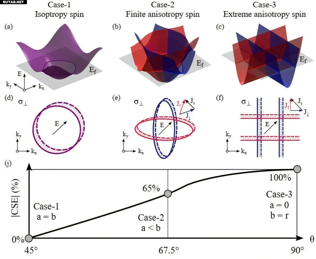 Вдохновлённые анализом модели, исследователи провели теоретические расчёты для работающего при комнатной температуре d-волнового альтермагнетика KV₂Se₂O. Результаты выявили наличие плоской поверхности Ферми с почти пренебрежимо малой дисперсией вдоль направления kz. Более того, два перпендикулярных набора поверхностей Ферми заняты противоположными спиновыми панелями. Это замечательно хорошо согласуется со сценарием, раскрытым в теоретическом моделировании, и указывает на потенциал исключительно высокой эффективности преобразования заряда в спин.