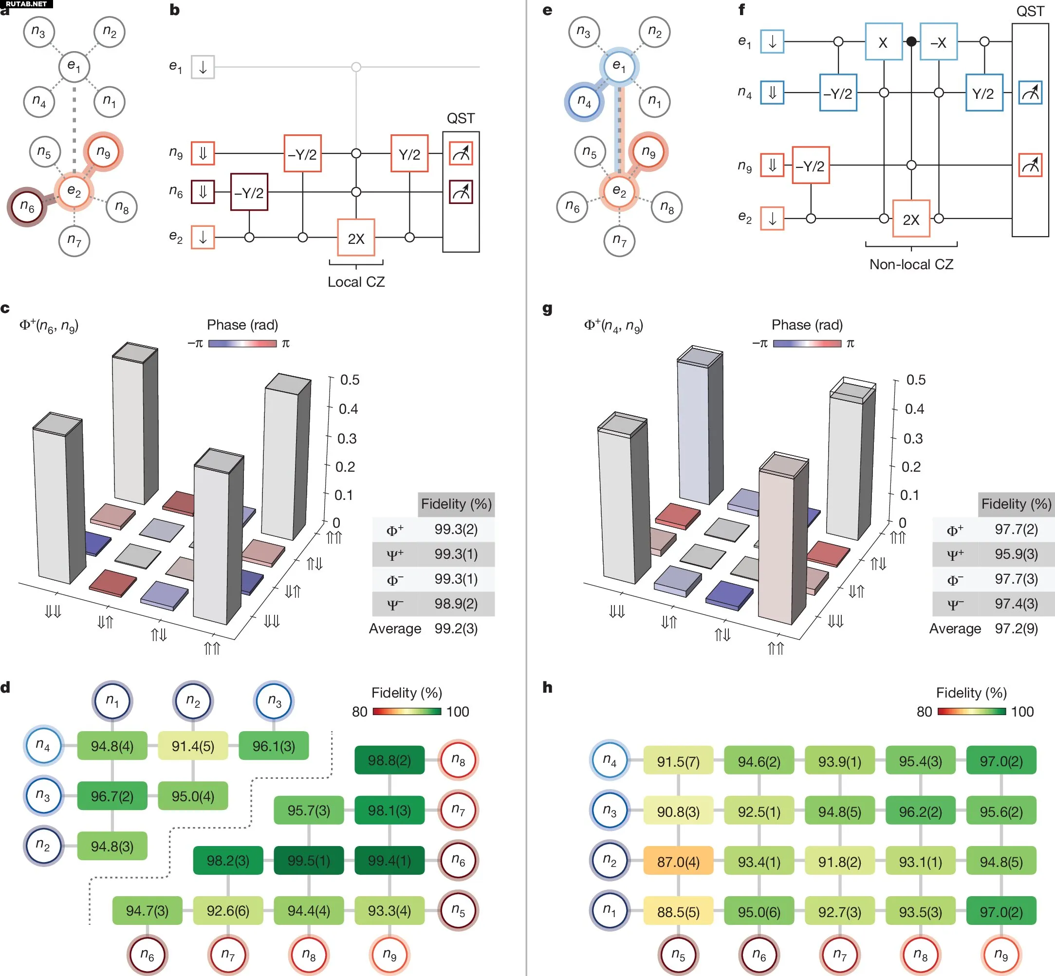 Команда сообщает, что каждая пара ядерных спинов в 11-кубитной системе была запутана с точностью от 91,4% до 99,5% внутри регистров и от 87,0% до 97,0% — между регистрами. Запутанность сохранялась для систем до восьми ядерных спинов. Впервые для кремниевых кубитов достигнута точность двух-кубитных операций в 99,9%.