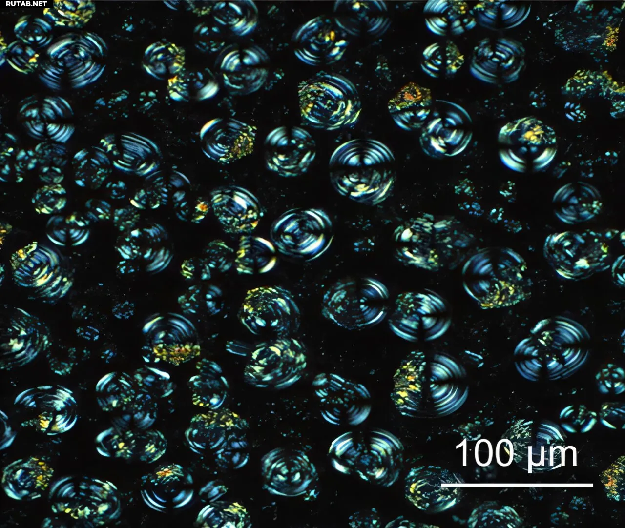 Изображение материала в твёрдом состоянии под поляризационным микроскопом. Автор: Доктор Стивен Коулинг, Йоркский университет.