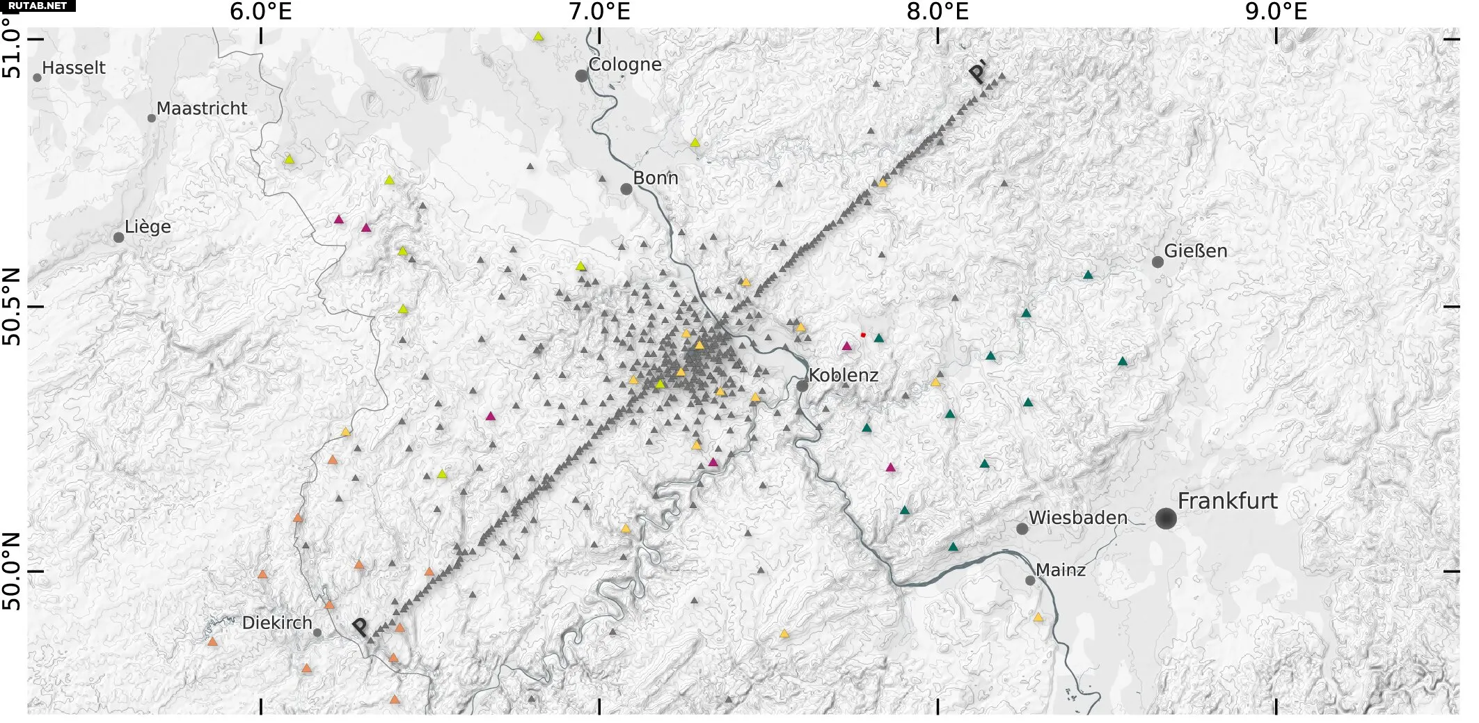 Расположение примерно 500 сейсмических станций, установленных в регионе Айфель в рамках эксперимента «Large-N». Автор: Marius Isken, GFZ (CC BY 4.0 Dahm et al. (2025); Seismica, Vol. 4 No. 2; https://doi.org/10.26443/seismica.v4i2.1492)