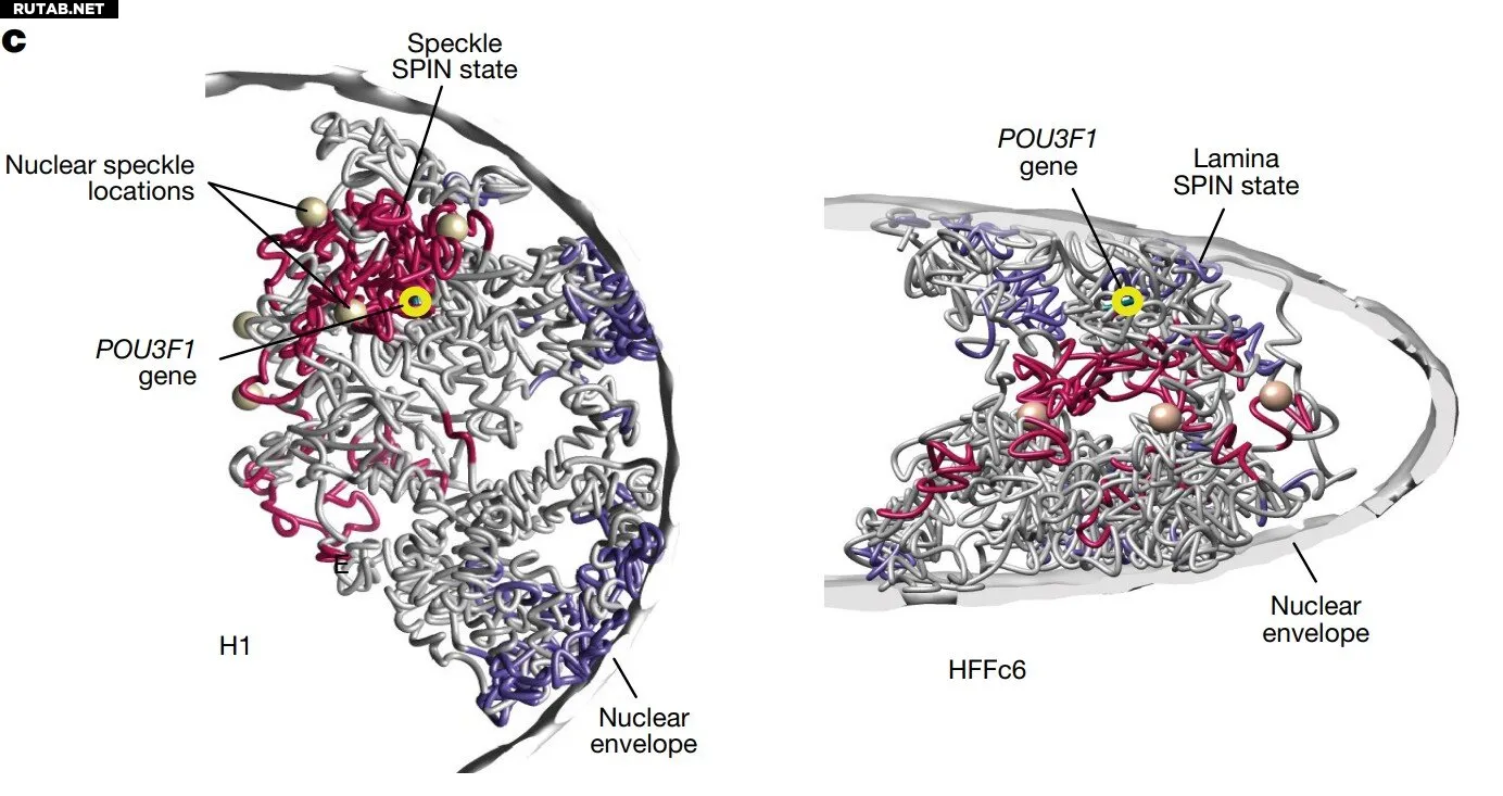 Представительные 3D-структуры хромосомы 1 в клетках H1 (слева) и HFFc6 (справа). Автор: Nature (2025). DOI: 10.1038/s41586-025-09890-3