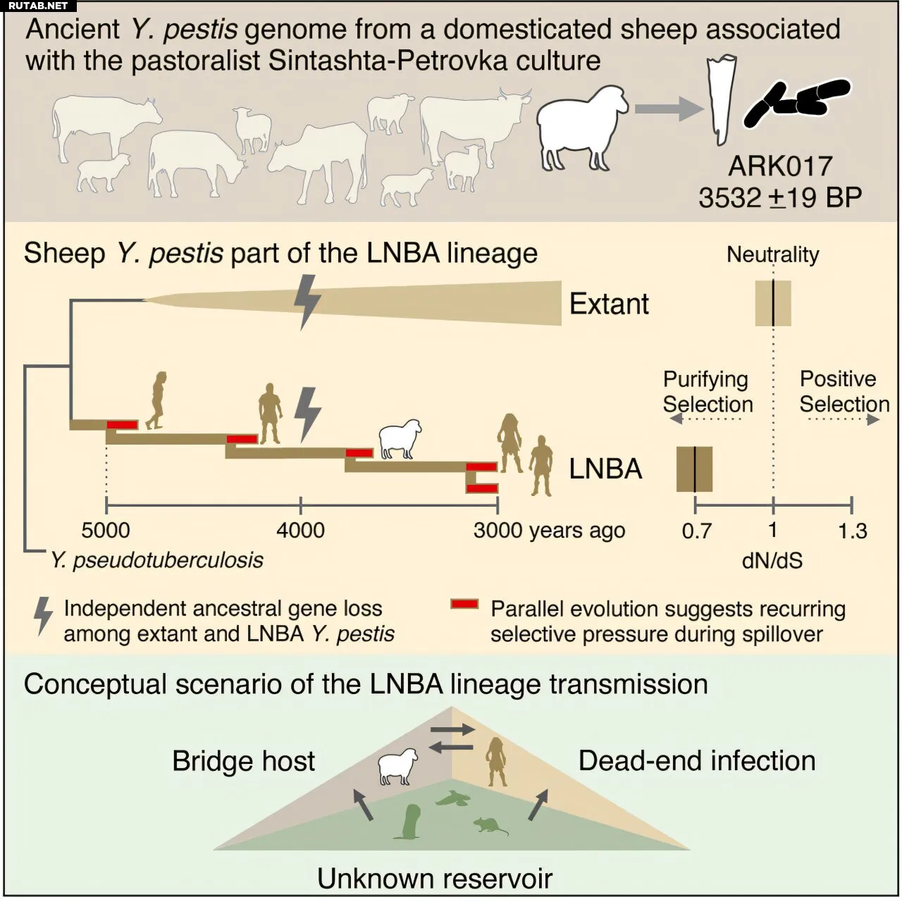 Международная группа исследователей обнаружила первое свидетельство заражения чумой бронзового века в животном. Учёные нашли ДНК бактерии Yersinia pestis в костях домашней овцы, жившей 4000 лет назад в укреплённом поселении Аркаим на Южном Урале. Это открытие, опубликованное в журнале Cell, даёт ключ к разгадке того, как чума распространялась по Евразии на протяжении двух тысячелетий.