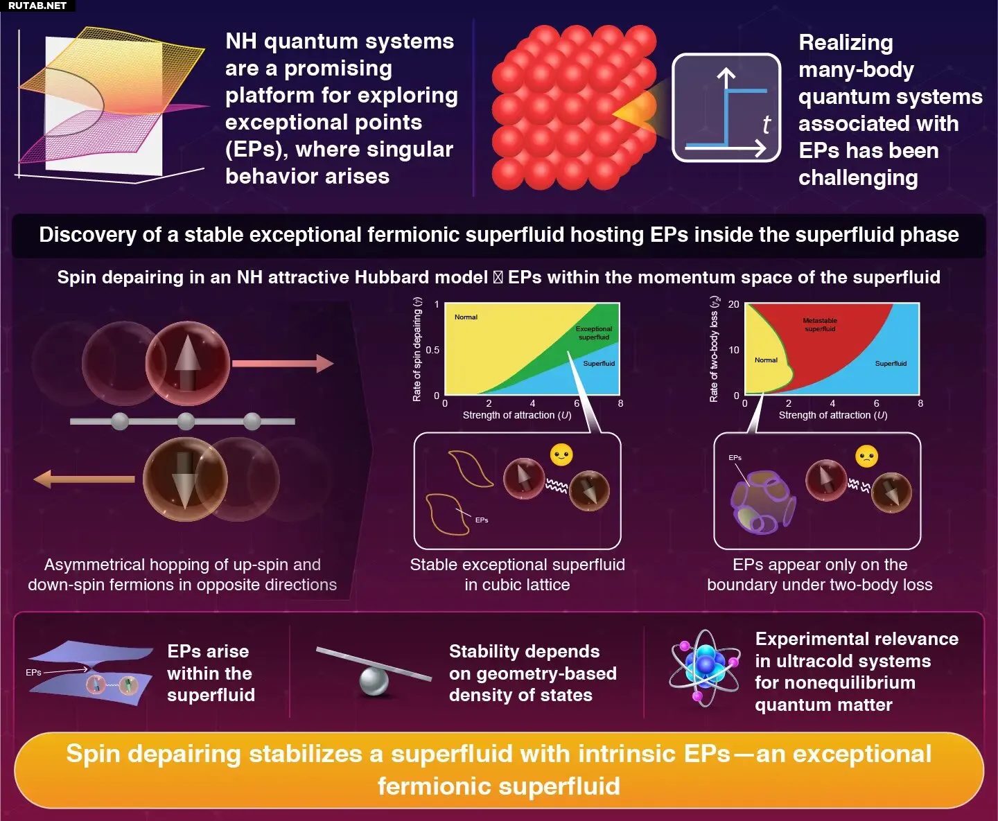 Исследователи из Института науки Токио обнаружили новую стабильную квантовую фазу — «исключительную фермионную сверхтекучесть». Она существует в неэрмитовых системах, где частицы могут теряться, и характеризуется наличием сингулярностей, называемых исключительными точками (EP), прямо внутри фазы, а не только на её границе.