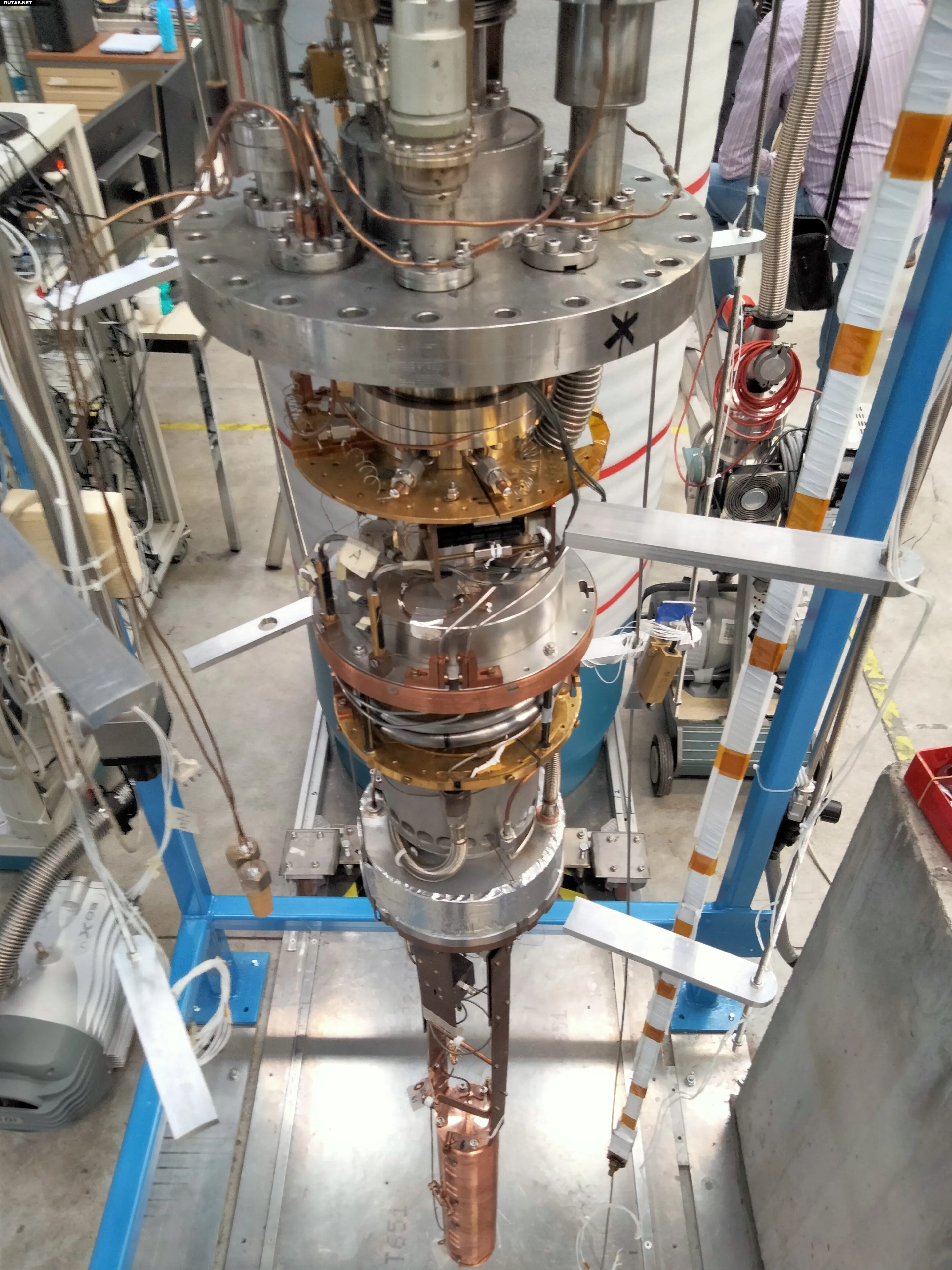 Последние ступени криостата, охлаждающего резонатор и электронику системы. Автор: QUAX Collaboration.