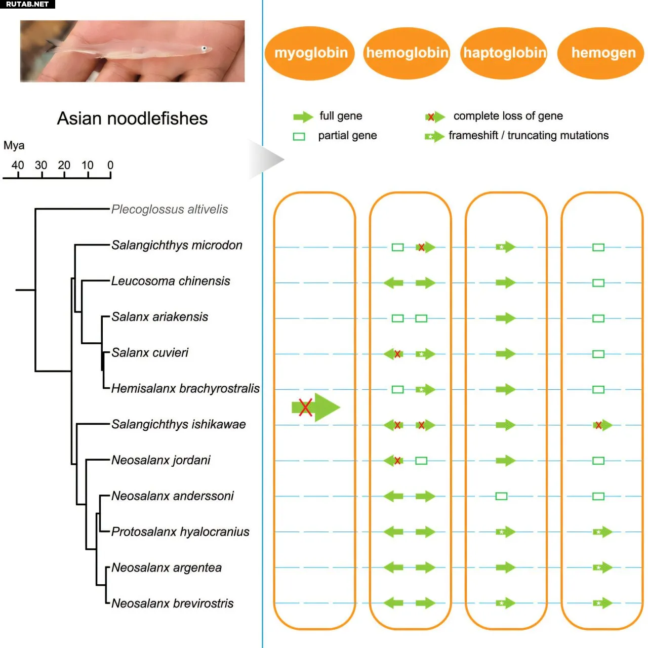 Ледяные рыбы потеряли способность производить эритроциты из-за удаления генов гемоглобина за миллионы лет в холодной, богатой кислородом воде Антарктики. Однако для тепловодных лапша-рыб, обитающих у побережий Китая, Кореи, Японии и Вьетнама, это объяснение не подходит.