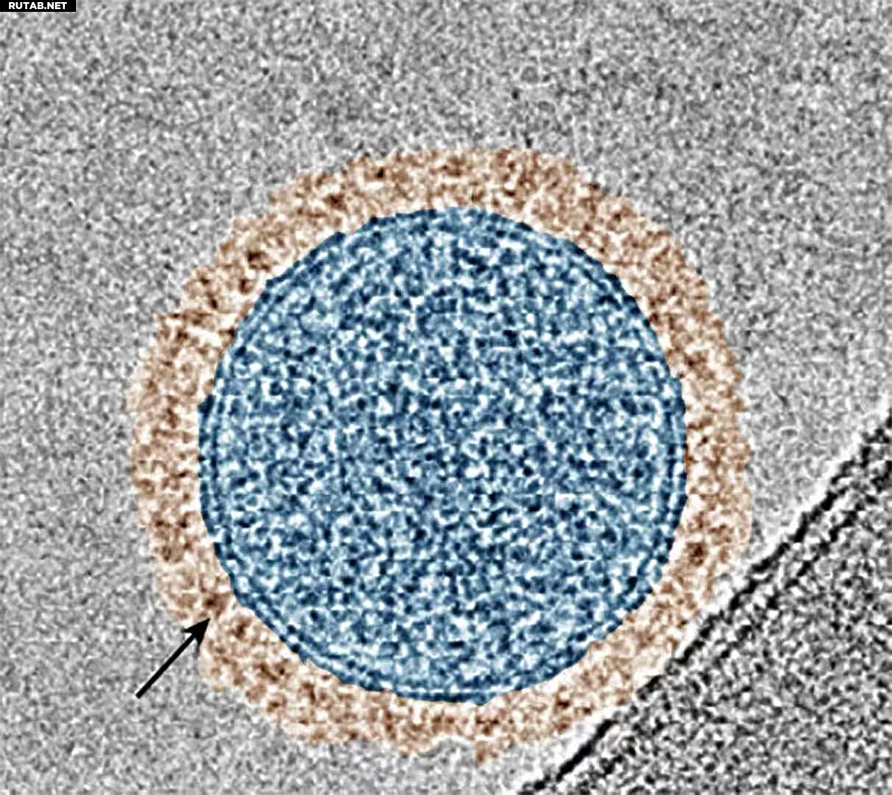 Цветное микроскопическое изображение экзосомы (синий цвет) с белками PD-1 на поверхности (коричневый цвет). Черная стрелка указывает на кольцо PD-1. Автор: Cheng Lab/Columbia Engineering