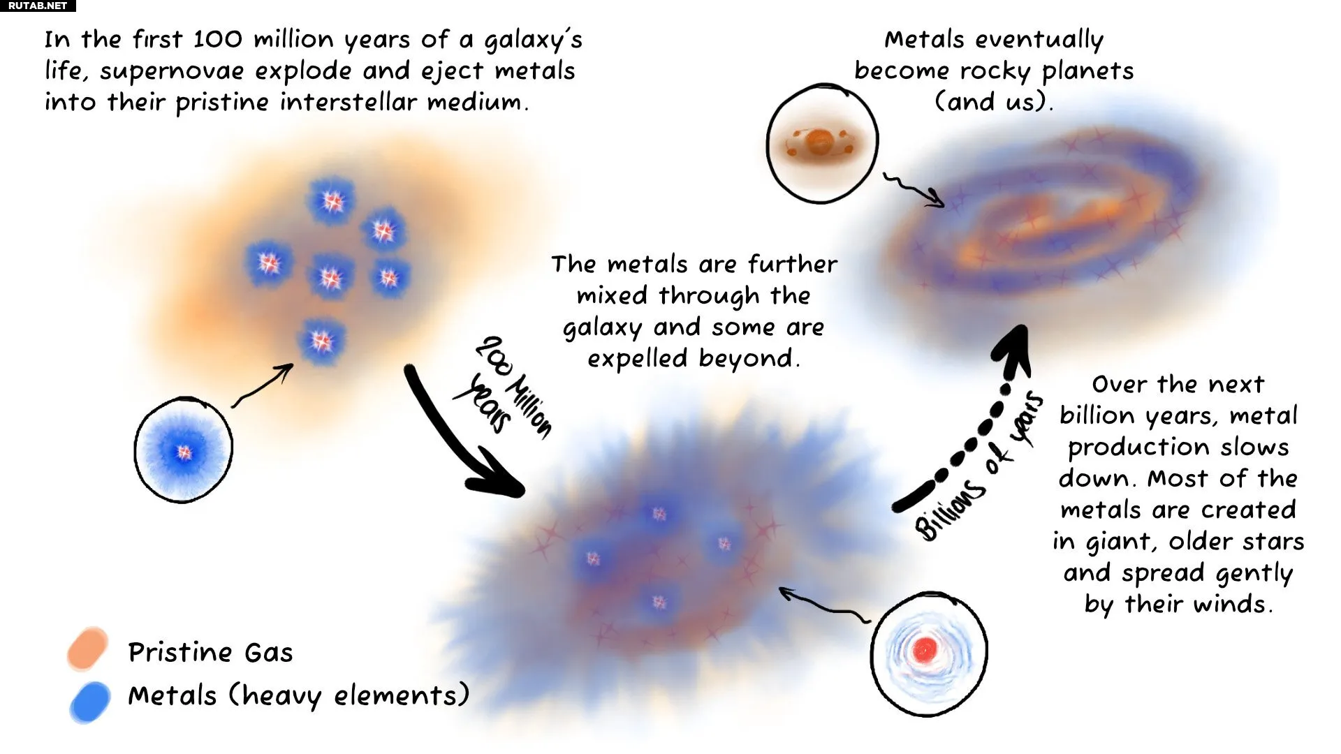 Схема эволюции производства металлов в галактиках. Автор: Калтех/Андреас Файст.