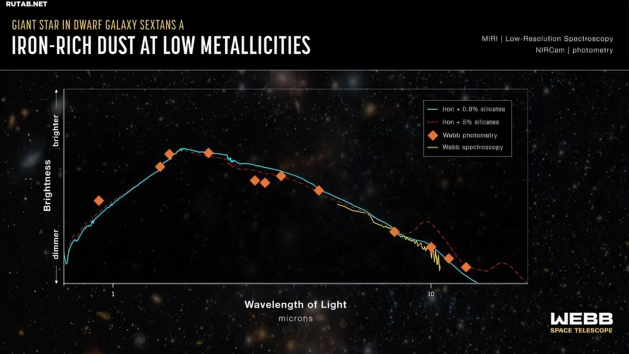 Астрономы с помощью космического телескопа NASA «Джеймс Уэбб» обнаружили в карликовой галактике Секстанс А два редких вида космической пыли: частицы металлического железа и карбида кремния, созданные стареющими звёздами, а также скопления углеродных молекул.