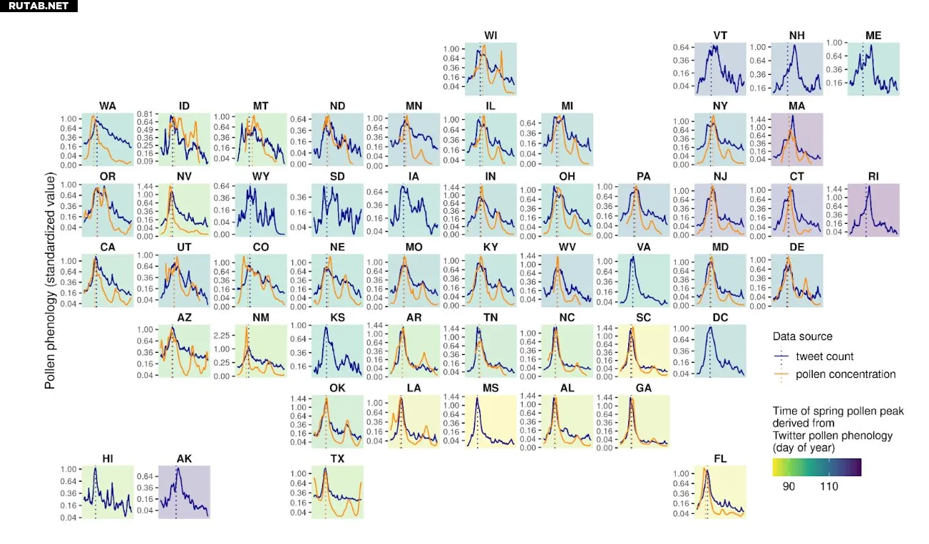 Анализ почти 200 000 постов в Twitter (ныне X) за 2012–2022 годы, проведённый учёными из Мичиганского университета, показал два ключевых вывода. Во-первых, пользователи точно определяют пик сезона пыльцы: всплески твитов часто совпадают с максимальными показателями пыльцевых счётчиков. Во-вторых, либерально настроенные пользователи с большей вероятностью связывают изменения в сезонах пыльцы с изменением климата, чем консерваторы.