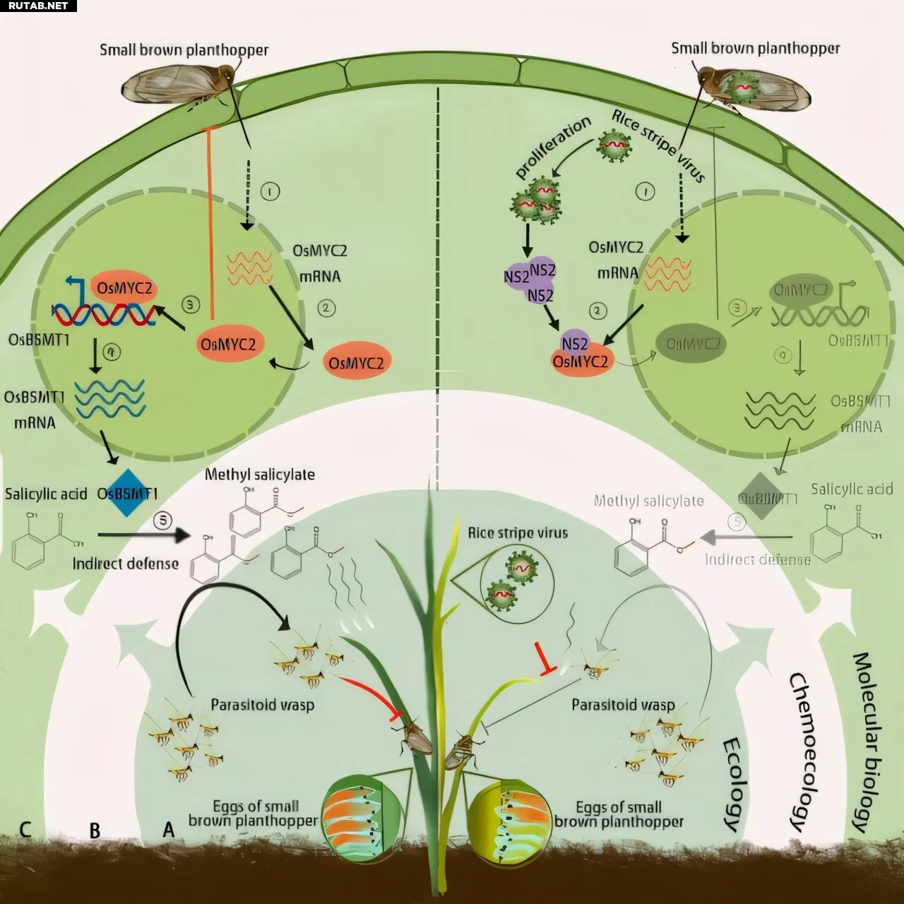 Однако вирусы, переносимые насекомыми, такие как вирус полосатой мозаики риса (Rice Stripe Virus), передаваемый мелкой коричневой цикадкой, могут нарушить эту систему защиты. С помощью своего белка NS2 эти вирусы подавляют биосинтез MeSA и фактически «заглушают» тревожный сигнал растения.