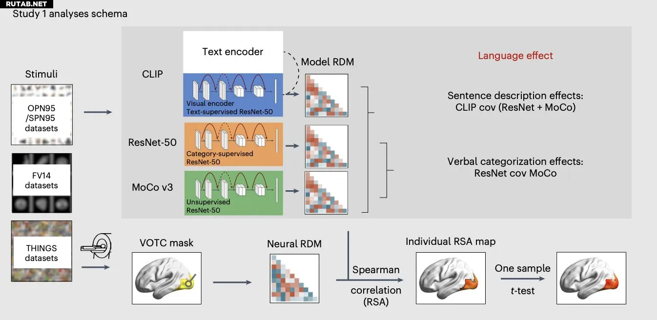 Учёные сравнили, как три модели глубокого обучения (ResNet, MoCo и CLIP) и человеческий мозг обрабатывают визуальную информацию. Модель CLIP, обученная на связях между изображениями и текстами, лучше всего предсказывала активность вентральной затылочно-височной коры (VOTC) — области мозга, отвечающей за распознавание объектов.