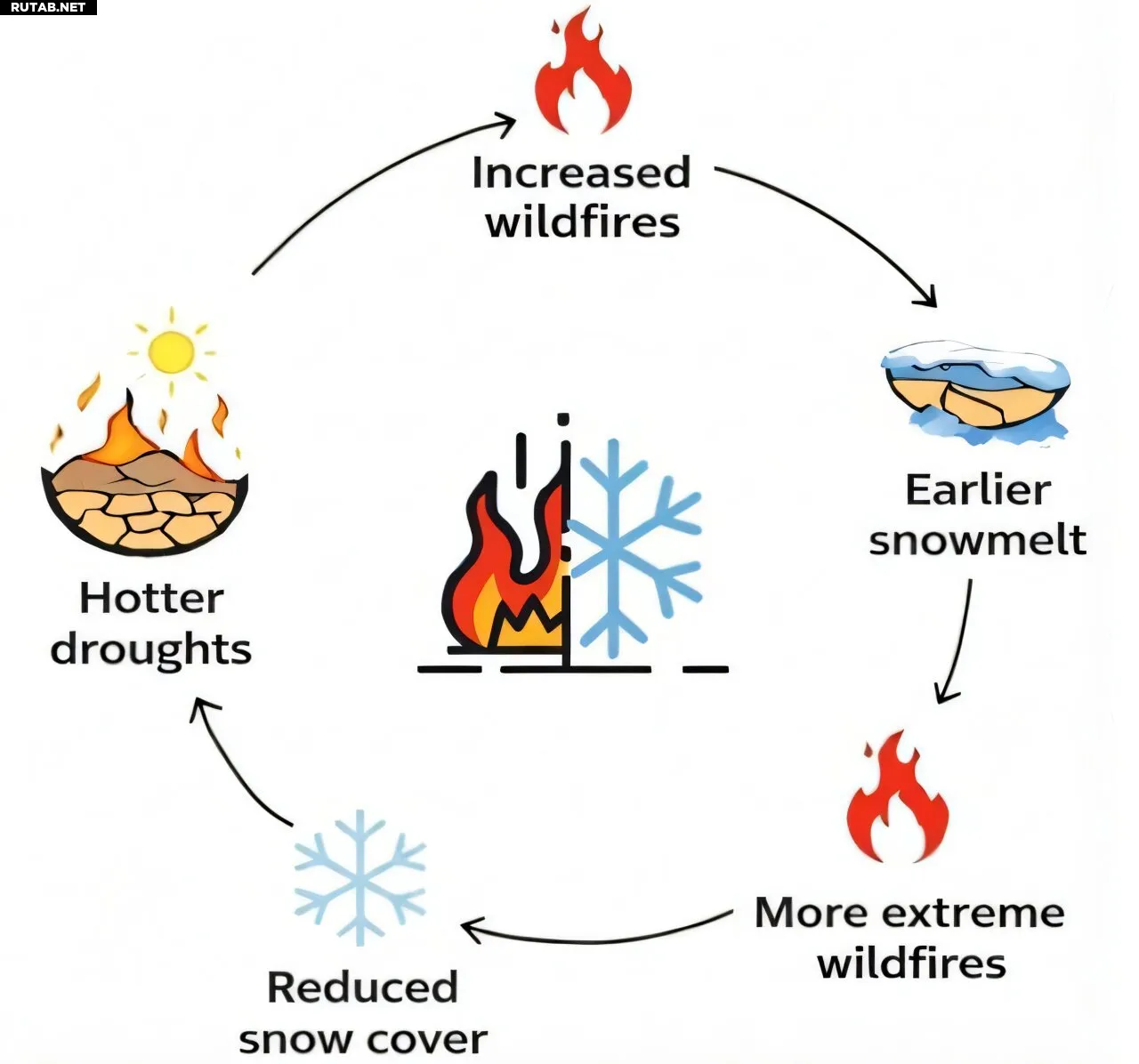 Опасная петля обратной связи: пожары сокращают снежный покров, что ведёт к более тёплой и сухой поверхности, способствующей новым пожарам. Автор: Hong Kong Polytechnic University