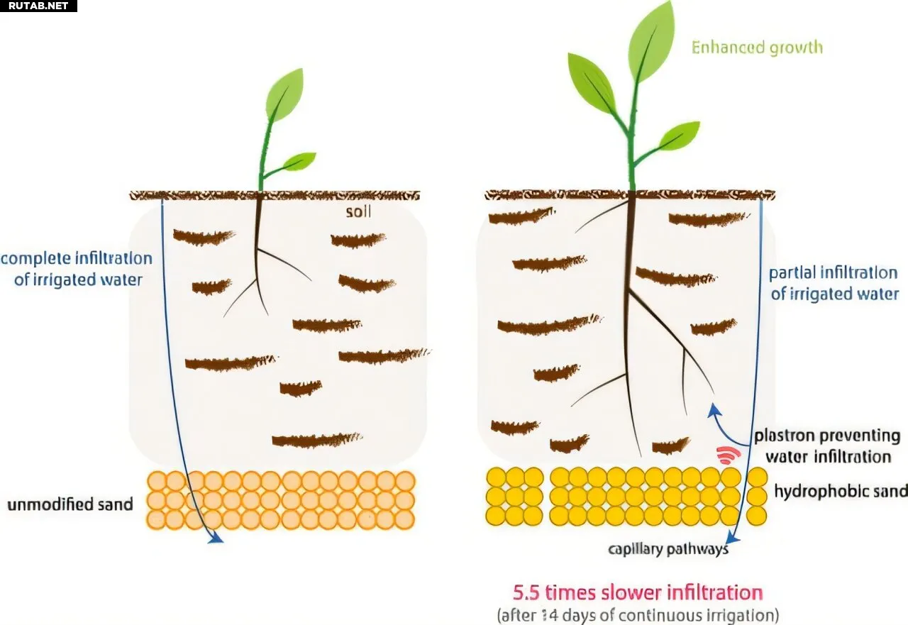 С ростом частоты и интенсивности засух, вызванных изменением климата, эффективное использование воды для орошения становится критически важным. Учёные модифицировали поверхность обычного песка, покрывая её сверхтонким слоем (менее 2 нанометров) органосилановых соединений. Это делает песок гидрофобным.