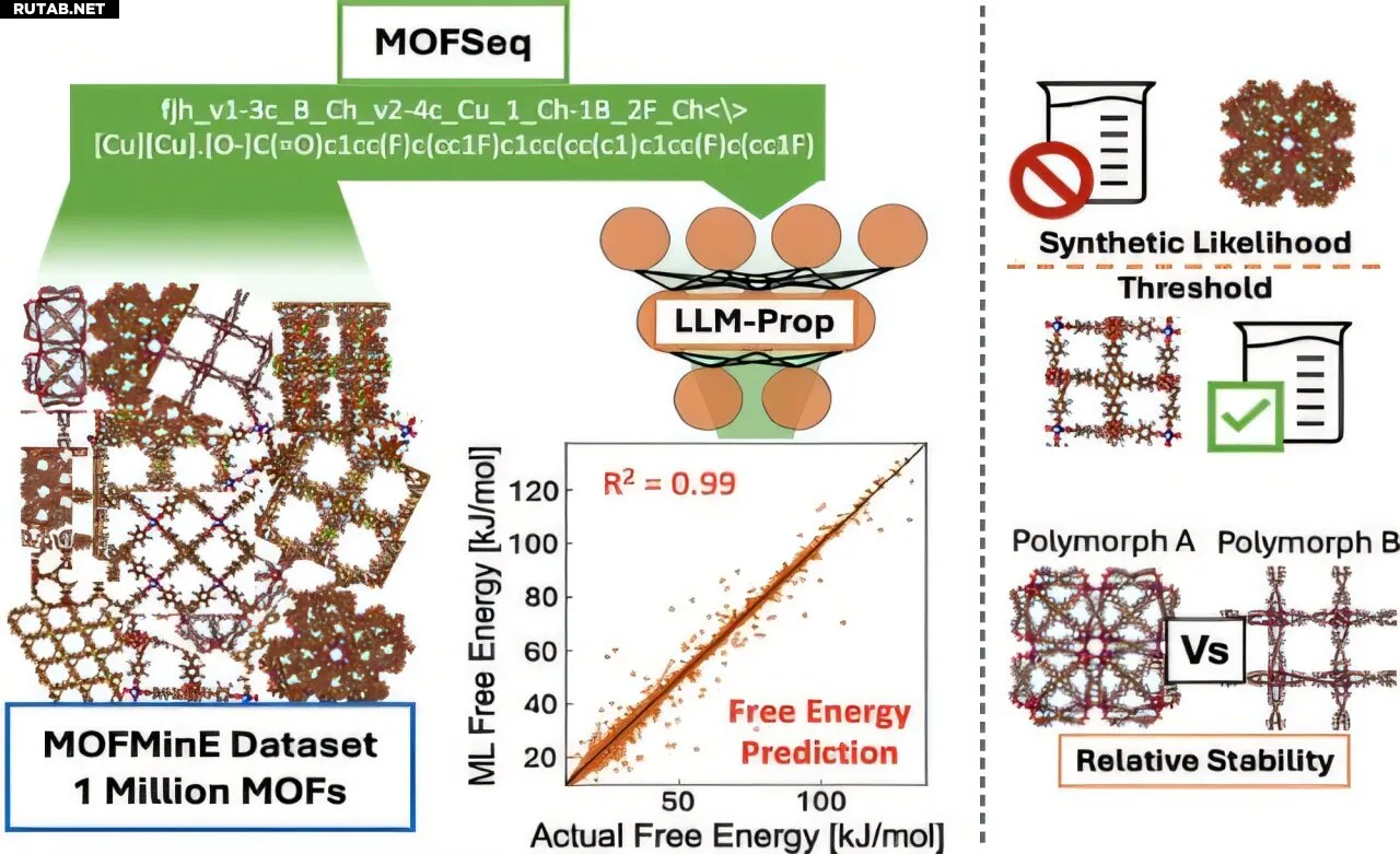 Используя эту систему, команда сгенерировала представления для миллиона MOF. Затем была обучена специальная языковая модель для предсказания значений свободной энергии. При тестировании на выборке из около 65 000 материалов с известными значениями точность предсказаний модели составила 97%.