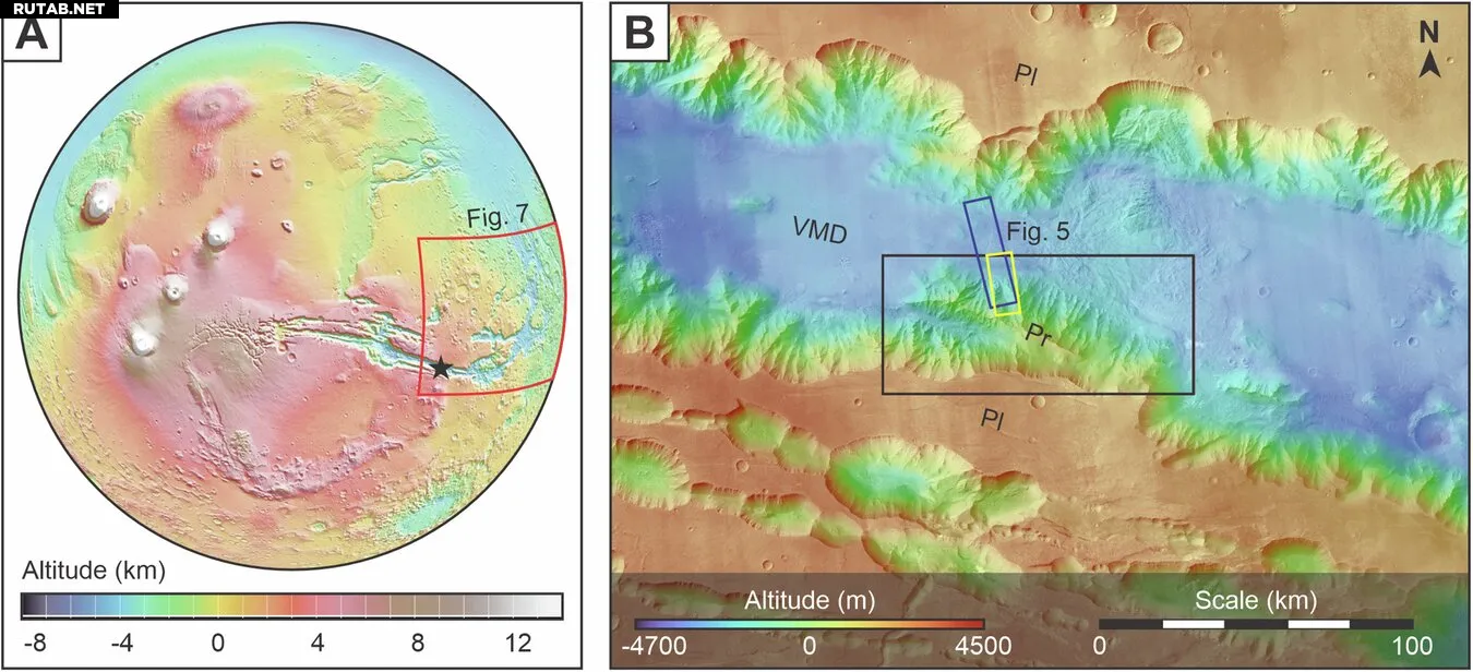Распространение отложений с уступом в долинах Маринера. Автор: npj Space Exploration (2026).