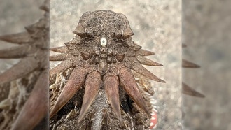 Два глаза выглядывают из-под раковины королевской стромбусы, сидящей на морском дне. Автор: Shedd Aquarium