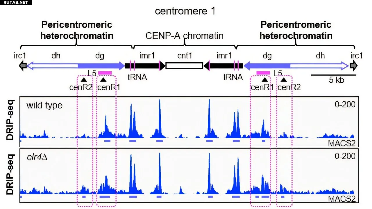 Данные иммунопреципитации ДНК-РНК (DRIP-Seq), показывающие накопление R-петель в мутанте с дефицитом гетерохроматина clr4∆. Автор: 2026, Ran Xu et al., Transcriptional PBR cycles at pericentromeric repeats cause gross chromosomal rearrangements through Rad52-dependent ADR-loop formation, Nucleic Acids Research