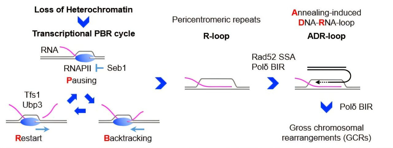 Больше информации: Transcriptional PBR cycles at pericentromeric repeats cause gross chromosomal rearrangements through Rad52-dependent ADR-loop formation, Nucleic Acids Research (2026). DOI: 10.1093/nar/gkaf1455
