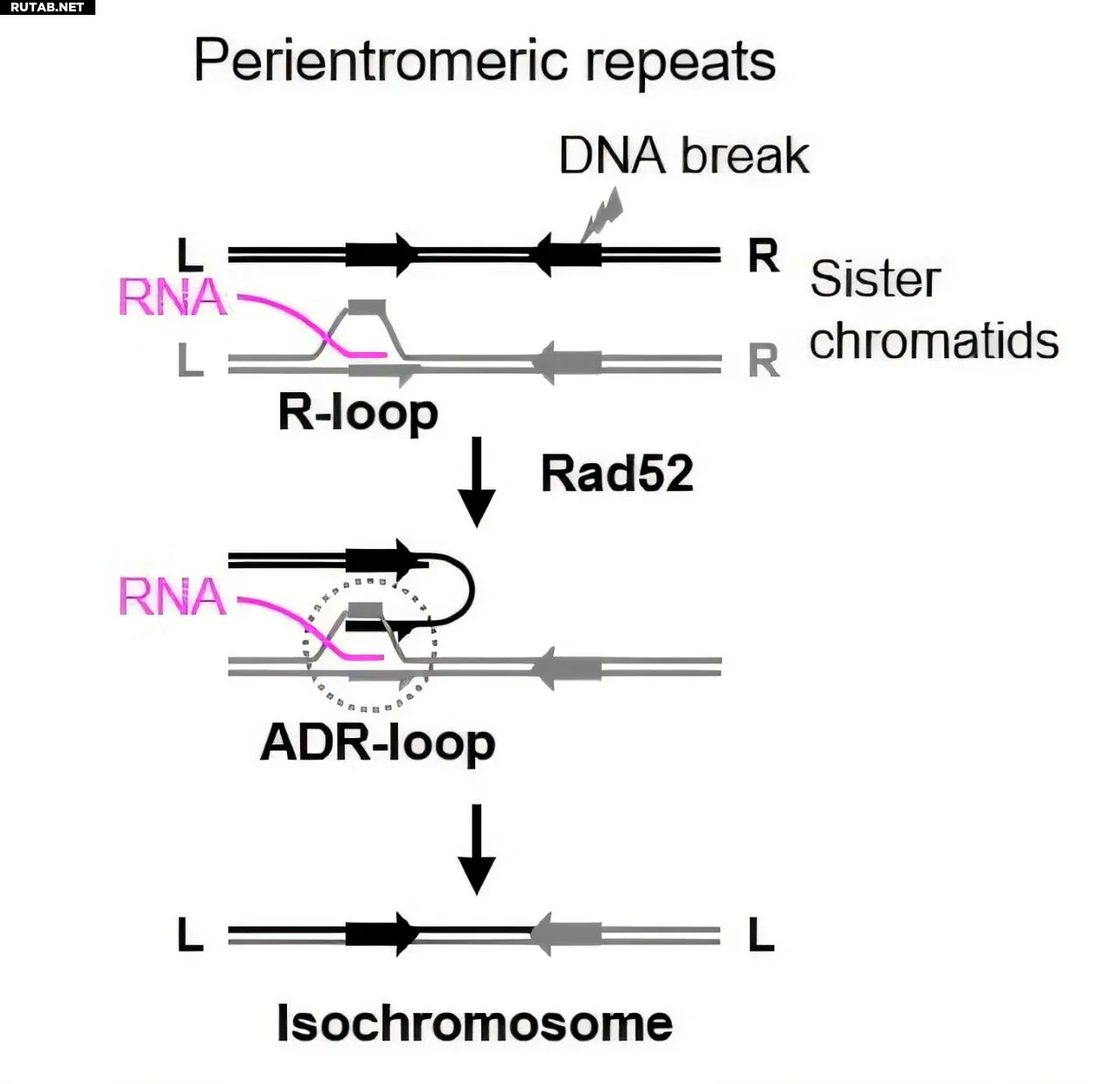 Белок Rad52 преобразует R-петли в ADR-петли, что приводит к образованию изохромосом. Автор: 2026, Ran Xu et al., Nucleic Acids Research