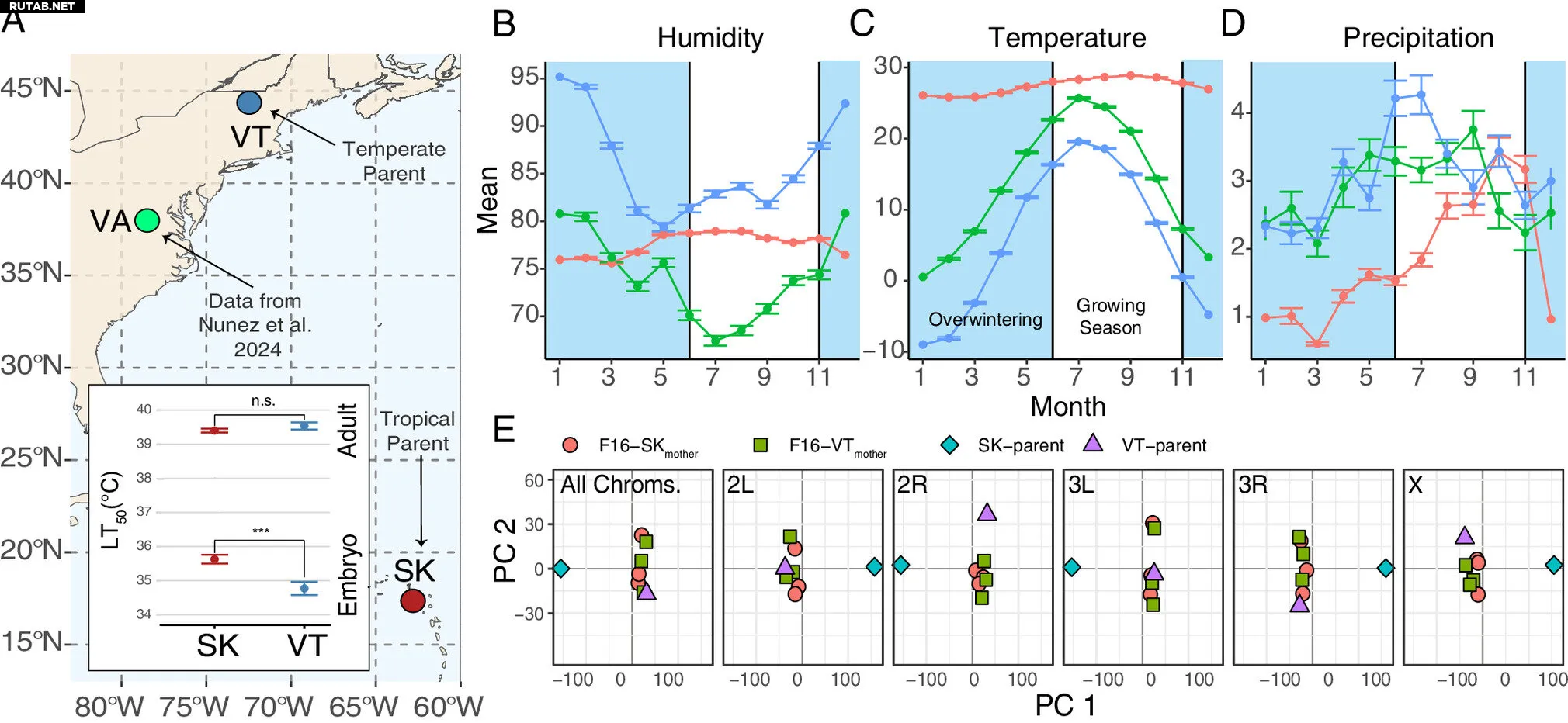 Исследователи из Университета Вермонта (США) изучили, как эмбрионы плодовых мушек Drosophila melanogaster реагируют на изменения температуры на геномном уровне. Учёные сравнили генетически различных мух из разных климатических регионов Северной Америки и обнаружили, что яйца мух из тёплых регионов (например, Карибского бассейна) более устойчивы к жаре, чем яйца мух из холодного климата (например, Вермонта).