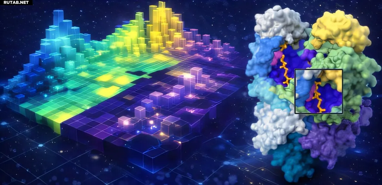 Слева — 3D-ландшафт, показывающий функциональные области, возникающие из парных взаимодействий вариантов. Справа — эти области проецируются на структуру мультимерного белка, где варианты в разных зонах могут быть изолированы в разных активных центрах, что позволяет восстановить функцию. Автор: Университет Джорджа Мейсона.