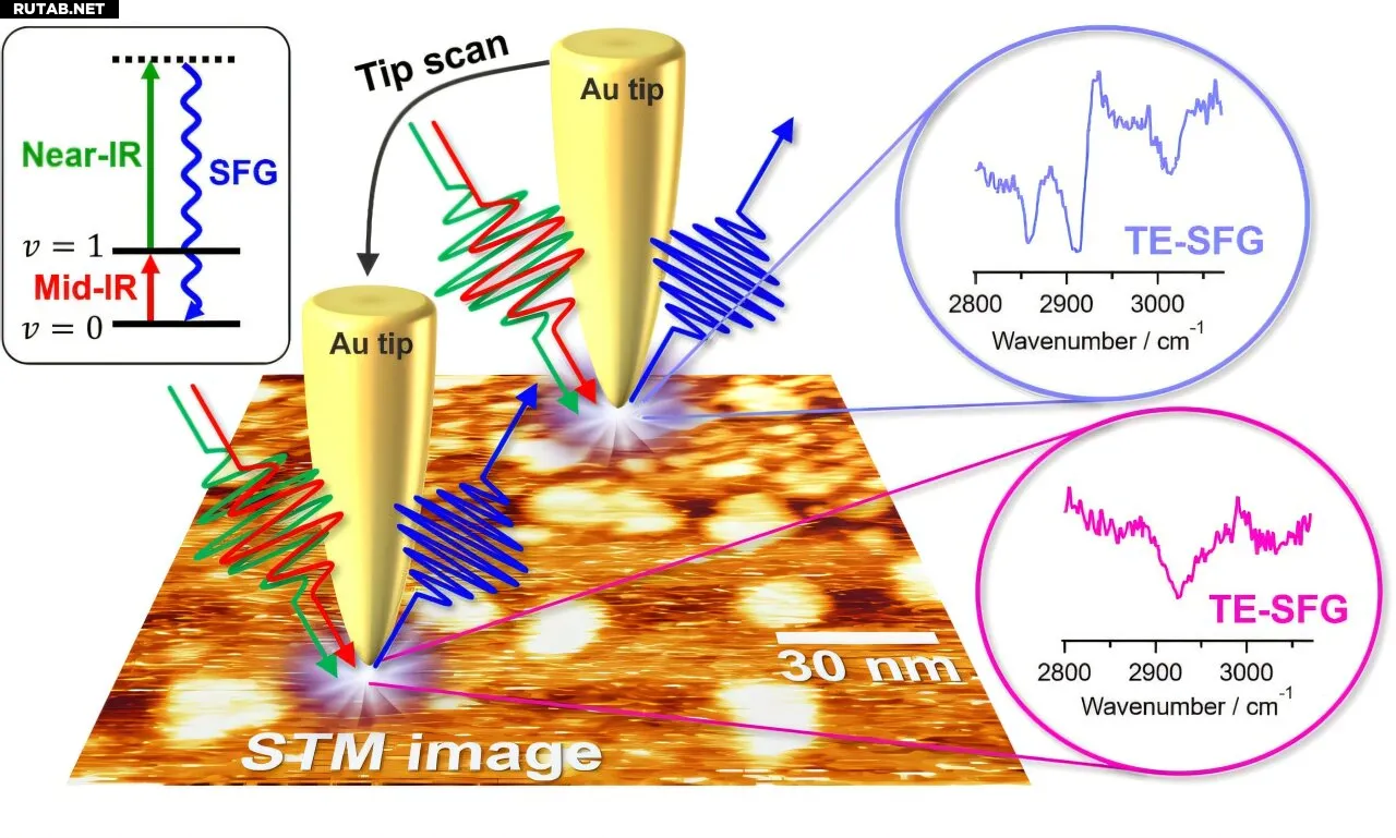 Учёные из Института молекулярных наук, SOKENDAI и Университета Тохоку преодолели это ограничение, использовав сильно сконцентрированное ближнее поле в плазмонном наноза́зоре сканирующего туннельного микроскопа (СТМ). Разработанная ими методика tip-enhanced SFG (TE-SFG) достигла пространственного разрешения около 10 нм, что позволило впервые напрямую визуализировать неоднородность наномасштабной ориентации молекул в агрегированных доменах на поверхности.