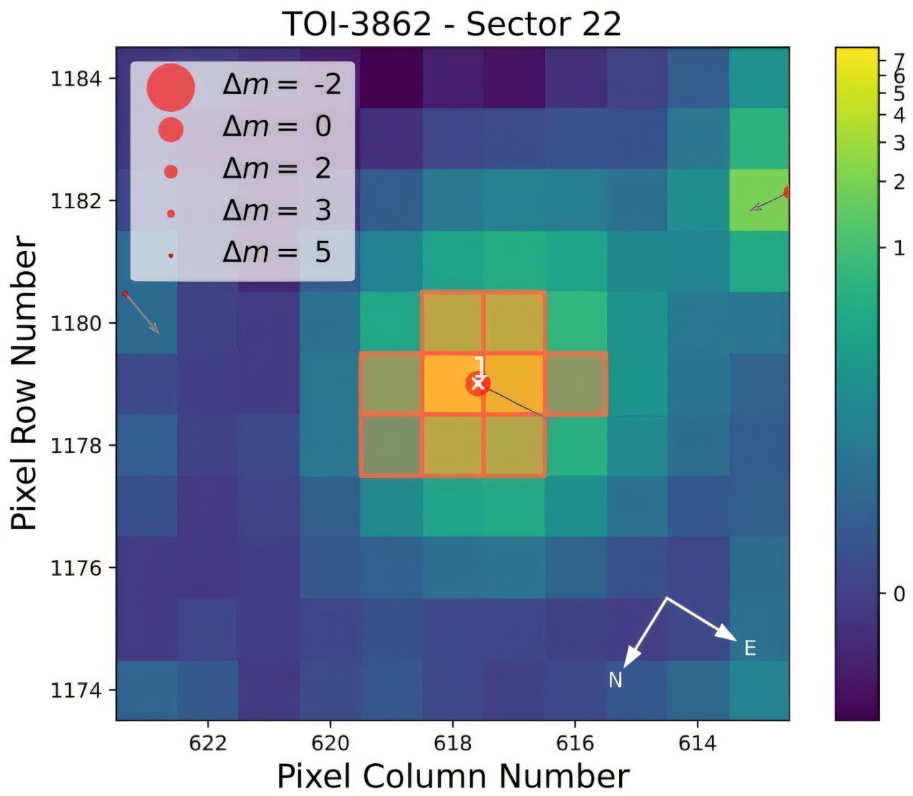 Целевой файл пикселей (TPF) TESS для сектора 22, звезда TOI-3862. Автор: arXiv (2026). DOI: 10.48550/arxiv.2601.10450