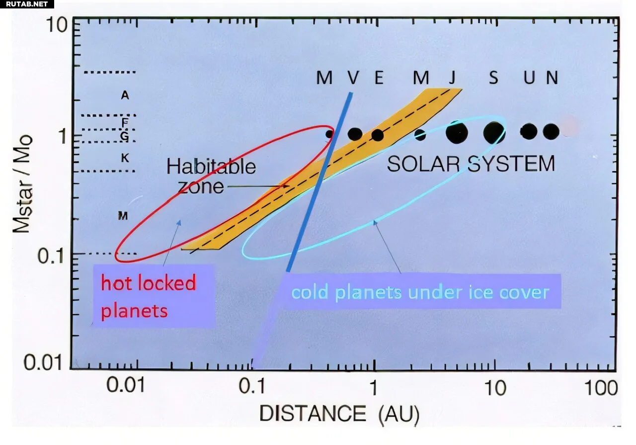 Традиционная и расширенная обитаемые зоны: Традиционная обитаемая зона показана оранжевой диагональной полосой. Её расстояние от звезды (горизонтальная ось, в астрономических единицах) увеличивается со светимостью, которая растёт с массой звезды и её спектральным классом (M, K, G и т.д.), показанным на вертикальной оси. Эллипсы представляют собой расширения обитаемой зоны, представленные в исследовании. Автор: Амри Вандель
