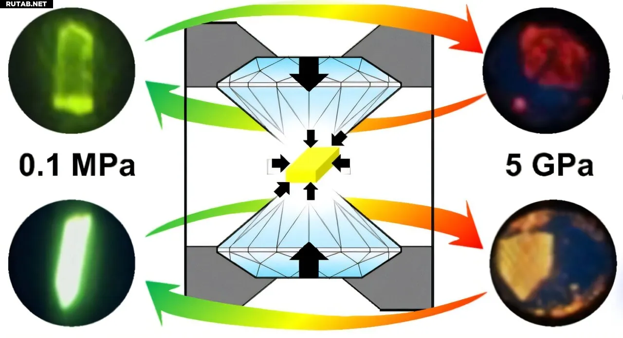 В одном кристалле, pCP-H, электронные облака естественным образом образуют пары в уложенных слоях, известных как π-димерные слои. Давление сближает эти пары ещё сильнее, усиливая слабые электронные силы между соседними молекулами и вызывая выраженное изменение цвета флуоресценции.