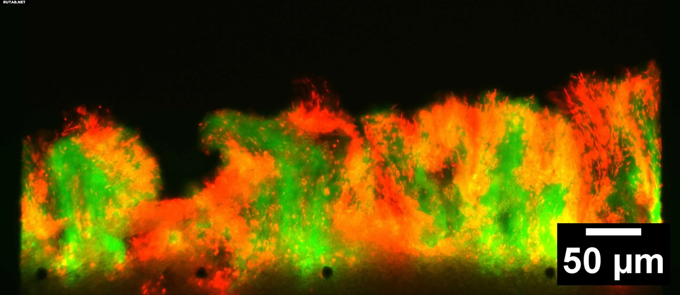 Под микроскопом видно, как бактерии образуют вокруг себя тонкую плёнку матрикса. Здесь представлены изображения двух бактерий, красной и зелёной, растущих вместе: бактерии слева растут в микрофлюидном канале, имитирующем пористую среду; бактерии справа растут на плоской поверхности и образуют цепочки. Автор: bioMatter Microfluidics Group