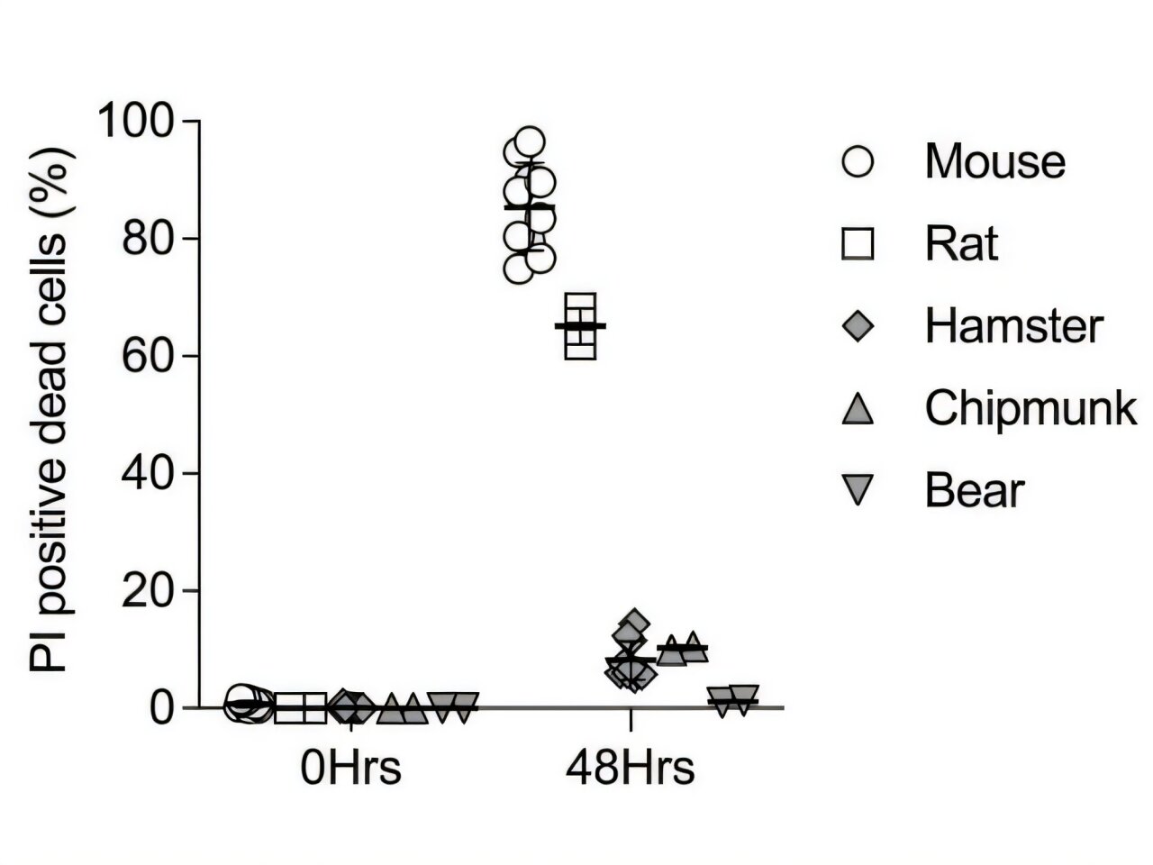 Учёные сравнили сателлитные клетки хомяков, бурундуков и чёрных медведей (впадающих в спячку) с клетками мышей и крыс (не впадающих в спячку). Клетки подвергали воздействию температуры 4°C. Клетки не-зимовщиков массово погибали, тогда как клетки зимоспящих видов демонстрировали высокую устойчивость.