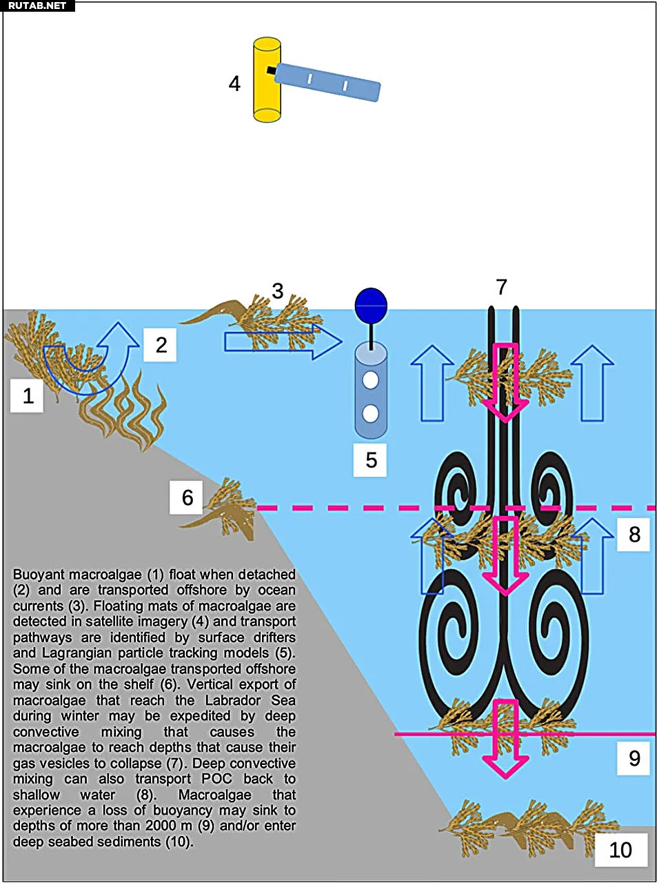 Детальные 3D-модели океана показали, что зимняя глубокая конвекция, вызванная охлаждением поверхностных вод, может погружать водоросли на большую глубину. Под высоким давлением их плавучие структуры разрушаются, что заставляет водоросли тонуть, унося углерод в глубины.