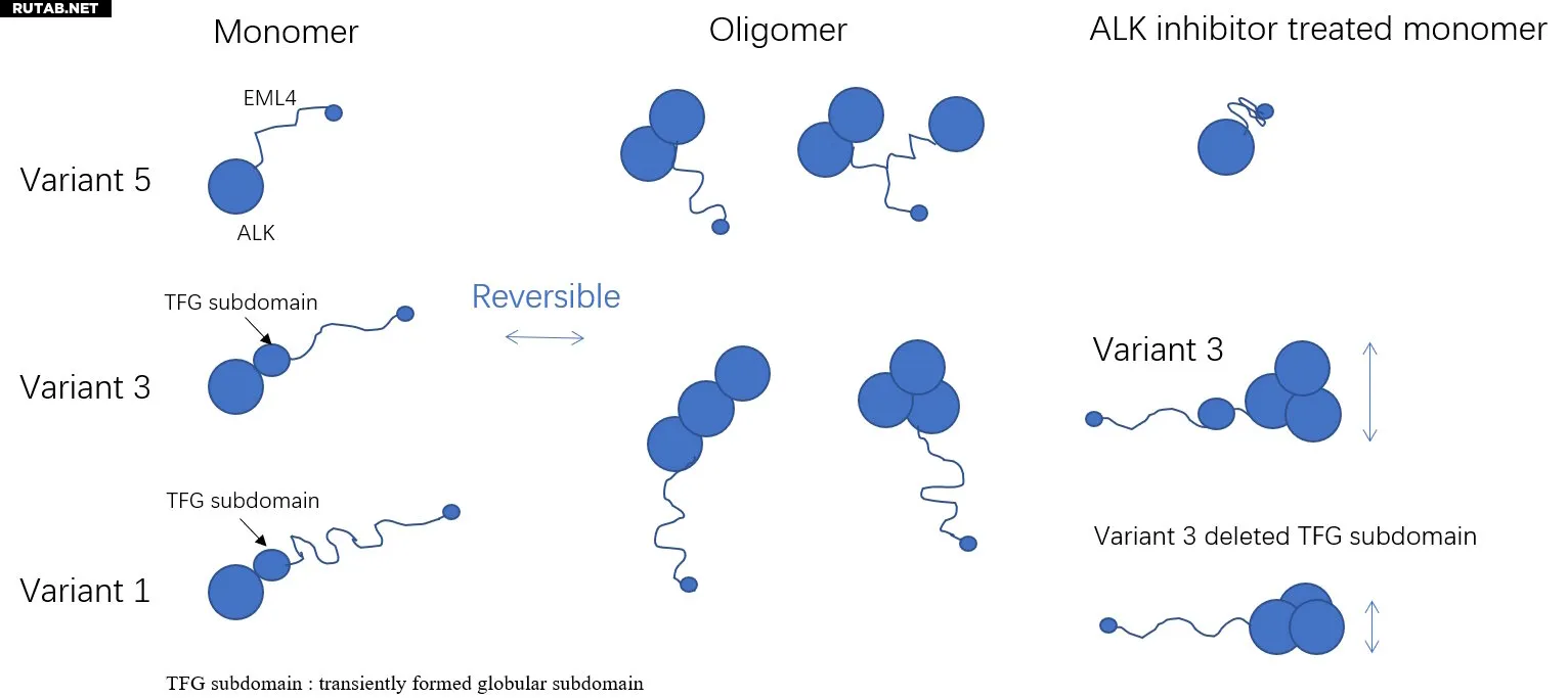 Схема трех вариантов EML4-ALK, наблюдаемых с помощью HS-AFM. Все три варианта продемонстрировали динамичные, обратимые переходы между мономерным, димерным и тримерным состояниями. Исследователи выявили ранее не охарактеризованный субдомен TFG внутри EML4, который может быть причинно связан с разнообразными паттернами олигомеризации, наблюдаемыми для доменов ALK. Напротив, ингибиторы ALK, такие как алектиниб, уплотняли EML4 и подавляли олигомеризацию EML4-ALK, что дает молекулярное обоснование его активности. Автор: Рисунок создан авторами на основе данных Сюйцзюнь Хан и др. (2026).