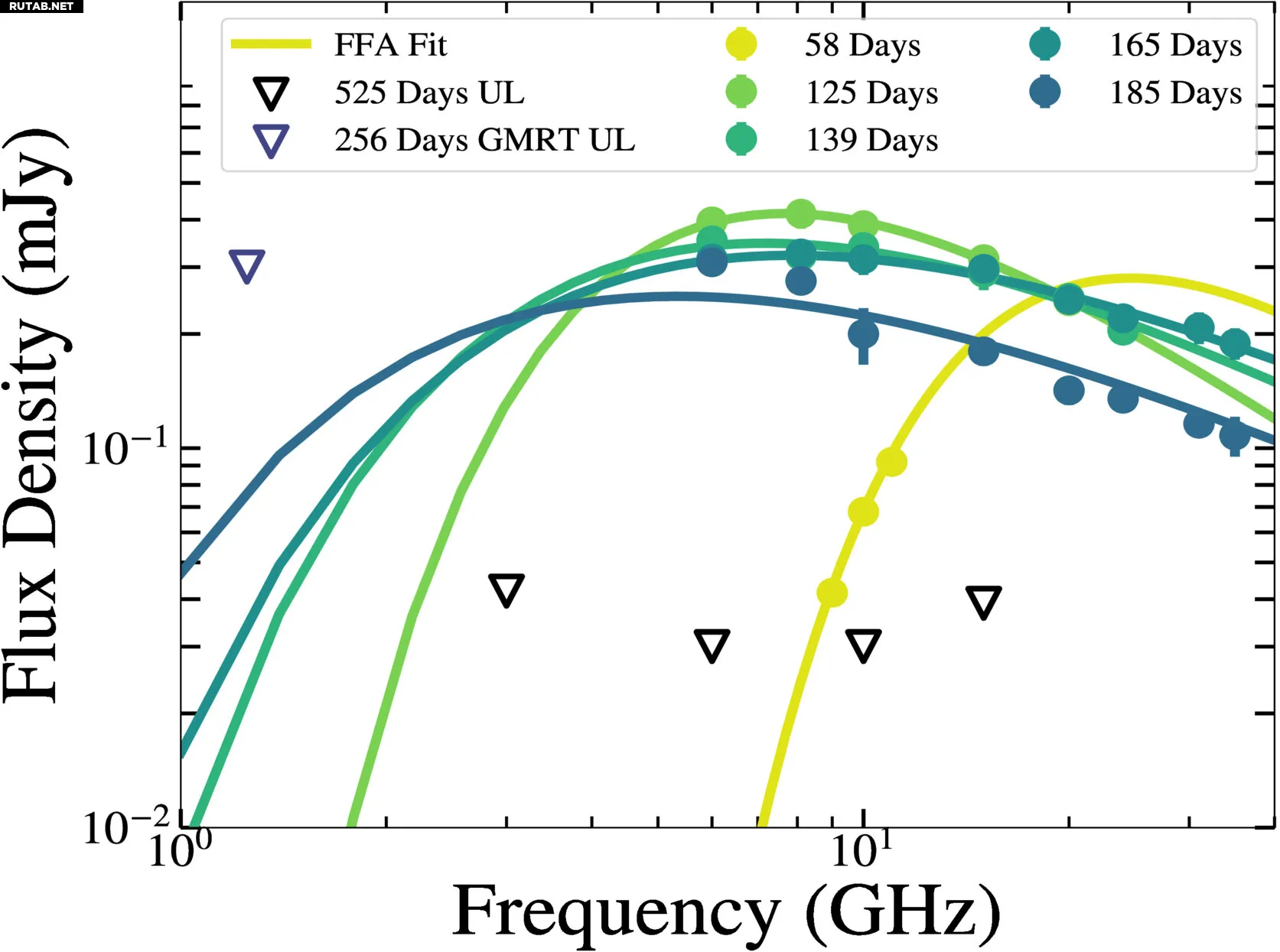 Радио SED сверхновой SN 2023fyq на частотах VLA (3–35 ГГц) в период от 58 до 525 дней после взрыва. Показаны модели с наилучшим соответствием для каждой эпохи. Треугольники, направленные вниз, обозначают верхние пределы плотности потока 3σ. Параметры этих подгонок приведены в Таблице 2. Автор: The Astrophysical Journal Letters (2025). DOI: 10.3847/2041-8213/ae1cb8
