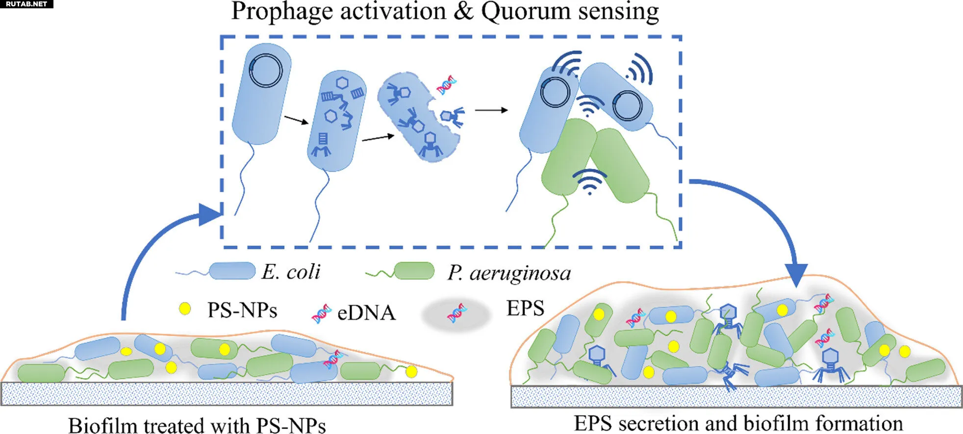 Исследование выявило, что при воздействии нанопластика на биоплёнку, состоящую из кишечной палочки и синегнойной палочки, запускается несколько процессов: бактерии начинают активнее «общаться», выделяя вещества, которые делают биоплёнку толще и прочнее; активируются профаги (вирусы бактерий), что приводит к разрушению некоторых бактериальных клеток; бактерии используют систему CRISPR для борьбы с вирусами.